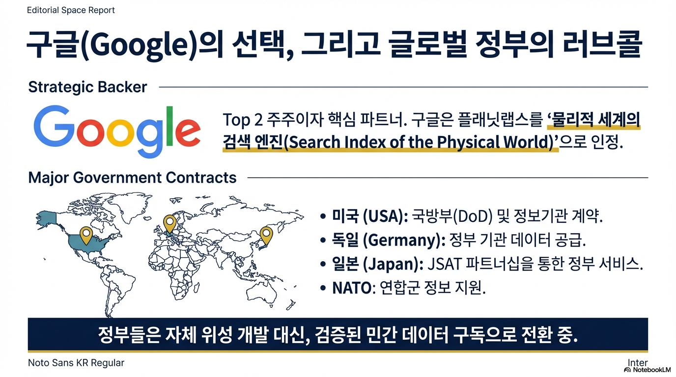 이들의 비즈니스 모델은 "너네 위성 쏘지 마. 우리가 쏴서 데이터를 줄게"라는 한 문장으로 요약할 수 있습니다. 이는 단순히 혁신적인 것을 넘어선 패러다임의 전환입니다. 플래닛 랩스는 국가나 거대 기업이 자체 위성 프로그램을 개발하고 발사하는 데 필요한 막대한 규모의 설비 투자(CAPEX)를, 예측 가능한 운영 비용(OPEX)인 구독형 서비스(SaaS)로 바꾸어 버립니다. 이를 통해 최고 수준의 지리 공간 정보에 접근하는 진입 장벽을 급격히 낮추는 것입니다. 이미 독일과 일본 정부는 이 방식으로 플래닛 랩스와 다년 계약을 맺고 데이터를 공급받고 있으며, 이는 비즈니스 모델의 신뢰성을 입증하는 강력한 사례입니다.