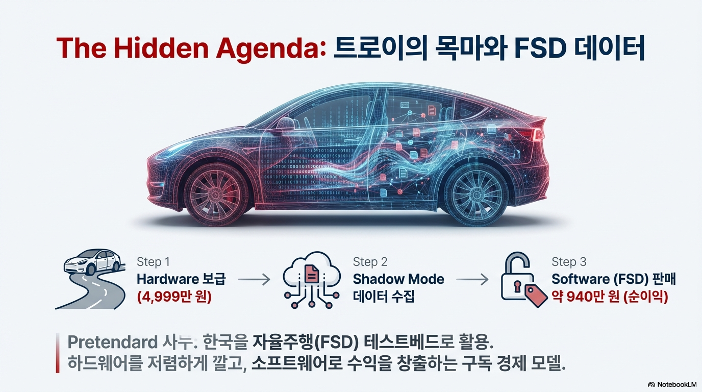 가격 인하를 통해 더 많은 차량을 보급하는 것은, 곧 더 많은 데이터 수집 장치를 도로에 배치하는 것과 같습니다. 이 데이터는 복잡한 한국의 도로 환경에 최적화된 완전 자율주행(FSD) 기술을 완성하는 데 필수적입니다. 그리고 이렇게 완성된 FSD 기능은 훗날 940만 원에 달하는 고수익 소프트웨어 옵션으로 바로 그 차주들에게 다시 판매될 수 있습니다. 가격 인하는 미래의 더 큰 수익을 위한 데이터 확보 투자라는, 또 다른 계산이 깔려 있는 것입니다.