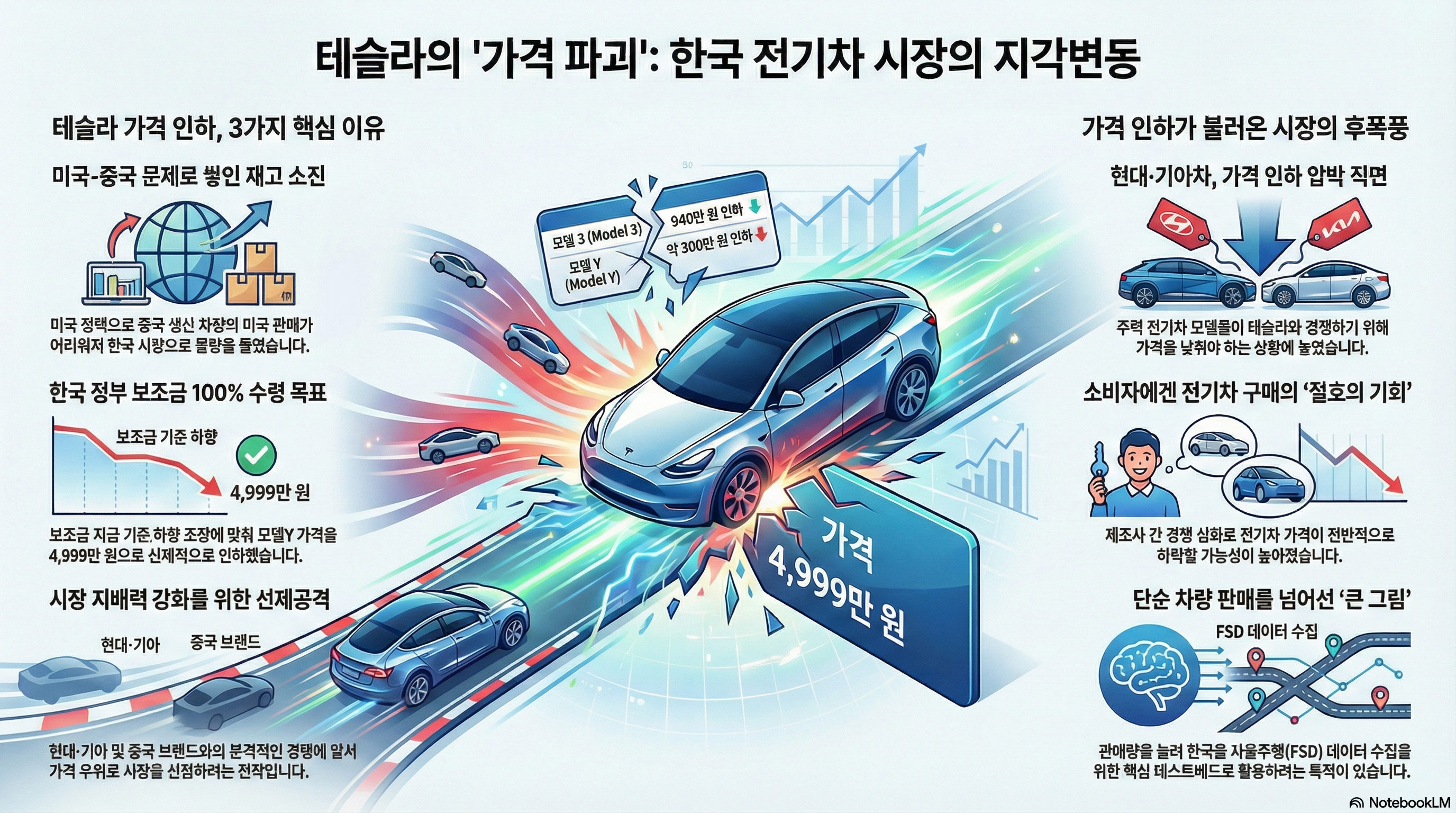 지난 연말, 테슬라가 모델 3와 모델 Y의 국내 가격을 최대 940만 원까지 인하하며 시장에 엄청난 충격을 안겼습니다. 불과 몇 달 전 제값을 주고 차를 산 구매자들에게는 "역대급 배신감"을, 전기차 구매를 망설이던 예비 오너들에게는 "절호의 기회"를 동시에 선사한 이 결정은 수많은 궁금증을 낳았습니다. 단순한 재고 소진일까요? 아니면 더 큰 그림이 있는 걸까요? 겉으로 보이는 가격표 뒤에 숨겨진, 테슬라의 치밀하고 다층적인 5가지 진짜 이유를 분석해 봅니다.