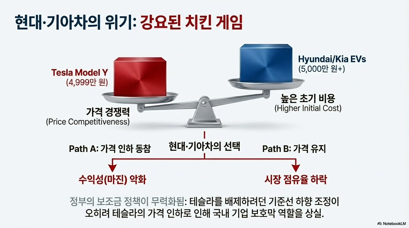 이번 가격 인하는 국내 완성차 업계, 특히 현대차와 기아차에 대한 노골적인 선전포고입니다. 현대·기아차의 주력 전기차 모델들은 대부분 5,000만 원을 살짝 넘는 가격대에 포진해 있습니다. 테슬라가 모델 Y의 가격을 4,999만 원으로 설정하면서, 현대·기아차는 보조금 100% 구간에서 경쟁하기 위해 가격 인하를 심각하게 고려해야 하는 딜레마에 빠졌습니다.