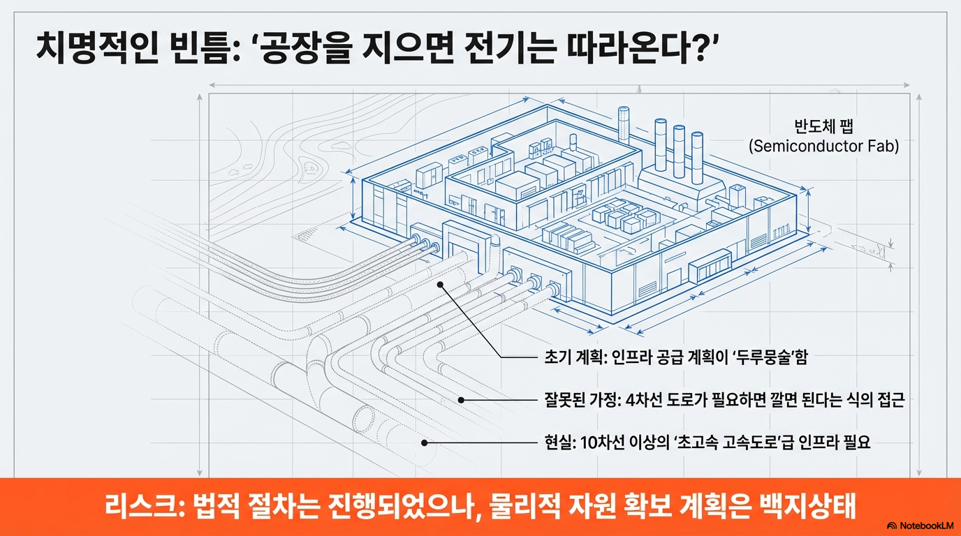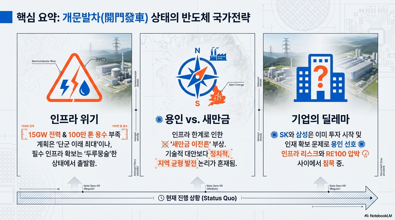 용인 반도체 클러스터 이슈는 단순한 부지 선정 문제가 아닙니다. 이는 감당 불가능한 인프라 수요가 냉정한 시장 현실과 충돌하고, 낡은 에너지 정책의 전환 요구와 맞물리며, 결국 모든 논의를 마비시키는 정치적 교착 상태에 빠진, 대한민국 국가 계획의 위기입니다.