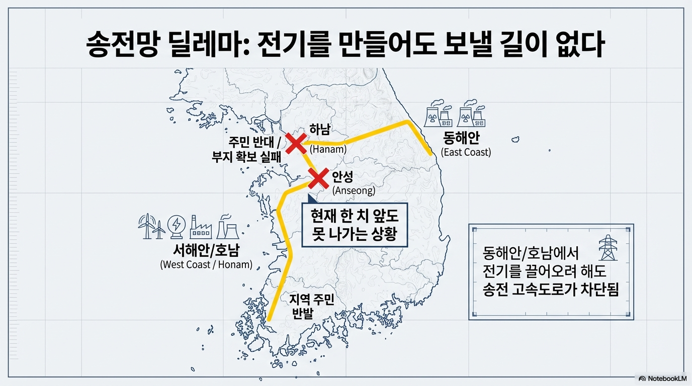 • 전력: 일부 LNG 발전소를 짓고, 동해안(경상도)과 서해안에서 전력을 끌어온다는 구상입니다. 하지만 이 계획은 고압 송전탑 건설을 둘러싼 하남, 안성 등 지역 주민들의 극심한 반대에 부딪혀 완전히 중단된 상태입니다. 이들의 반대는 단순한 지역 이기주의를 넘어, 절차적 부당함과 그에 상응하는 혜택 부재에 대한 정당한 문제 제기에 가깝습니다.
