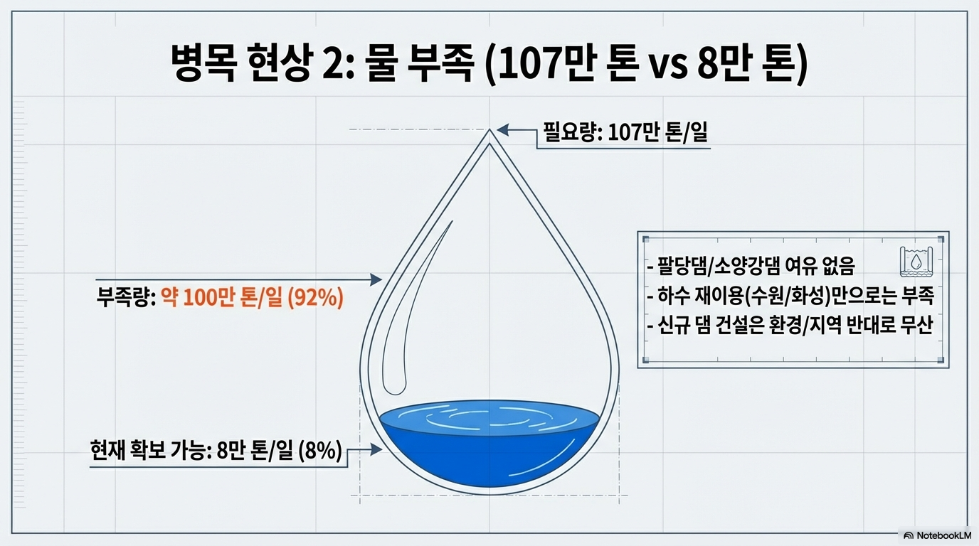 더 심각한 것은 물입니다. 하루에 필요한 용수량은 107만 톤이지만, 현재 용인 지역에서 즉시 공급 가능한 여유 용수량은 고작 8만 톤에 불과합니다. 결과적으로 매일 100만 톤에 가까운 물이 부족한 상황입니다. 이 숫자들은 극복해야 할 단순한 장애물이 아닙니다. 이는 첨단 팹(fab) 하나가 설계되기도 전에 프로젝트 전체의 존립 기반을 의심하게 만드는 ‘근본적 실행 가능성의 위기’를 의미합니다.