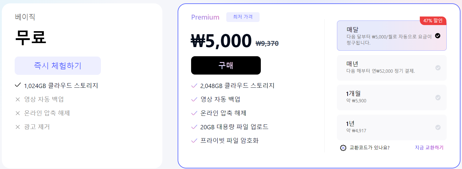 - 제한 사항: 무료 저장 용량이 매우 적음, 기본 기능 외에는 대부분 유료