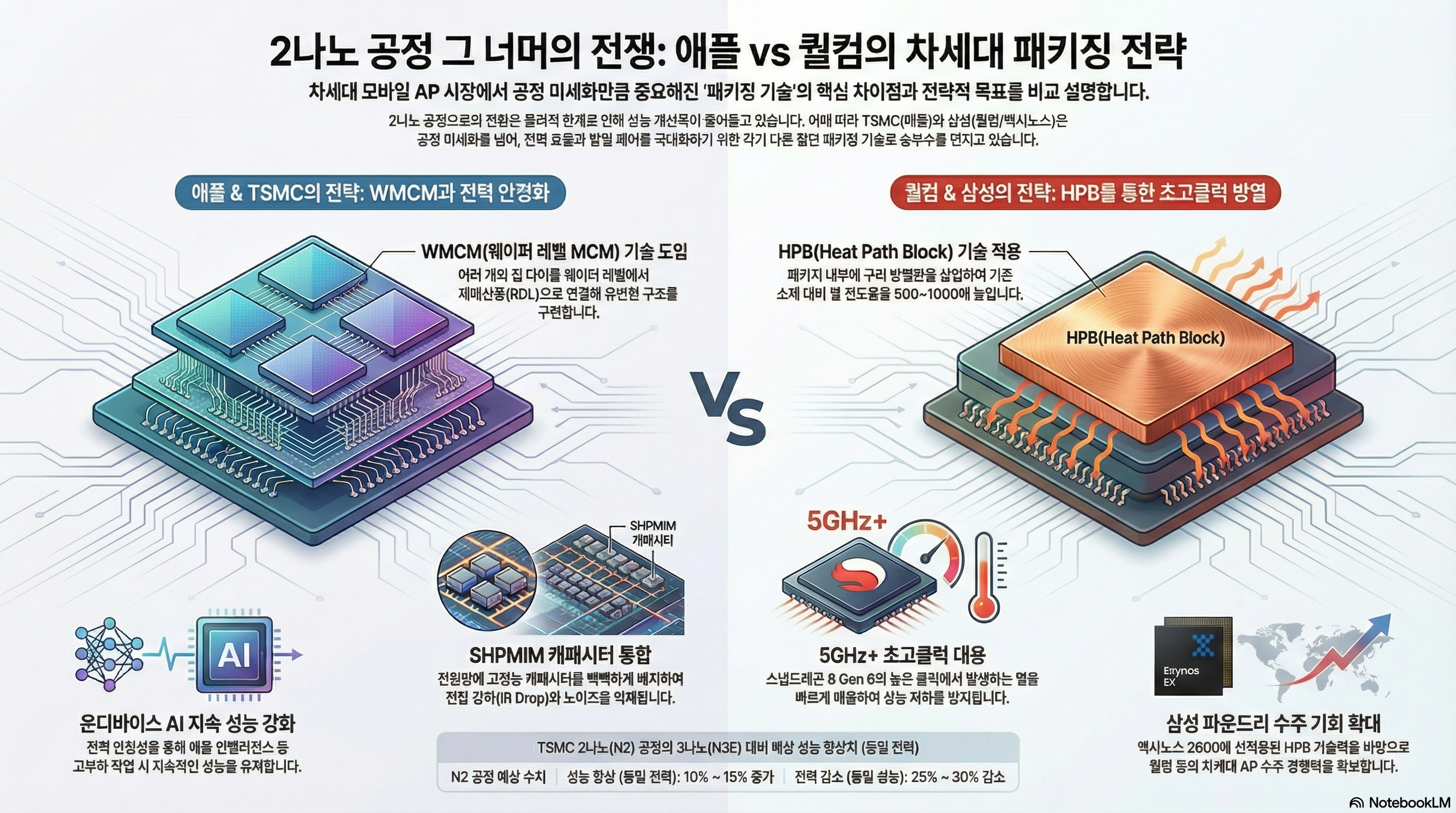 핵심은 칩의 논리 회로를 만드는 파운드리 공정과 완성된 칩을 포장하는 패키징 공정이 분리될 수 있다는 점입니다. 퀄컴은 이론적으로 스냅드래곤의 핵심 로직 다이(Die)는 TSMC의 2나노 공정으로 제조하고, 이후 패키징 공정만 삼성의 HPB 기술을 이용하는 것이 가능합니다.