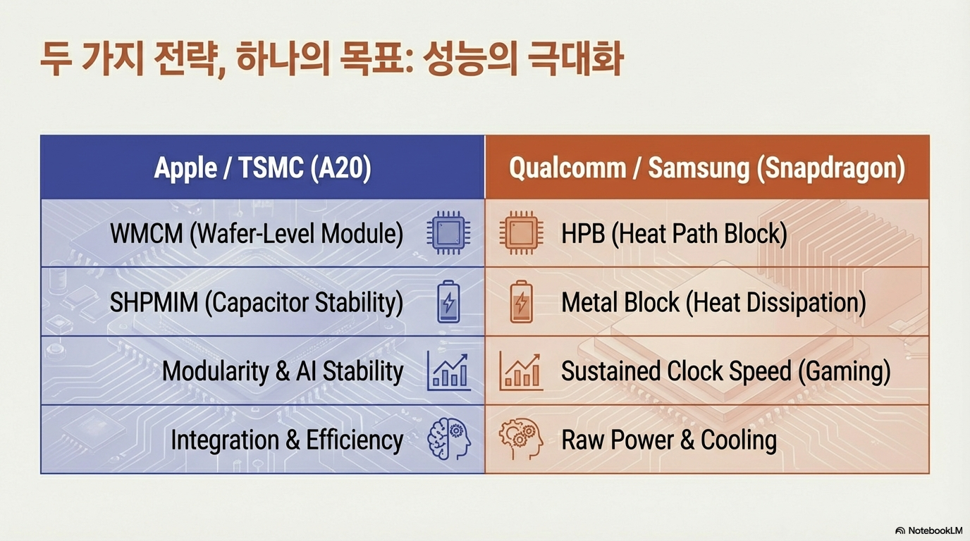 결국 우리는 두 개의 상이한 미래를 목격하고 있습니다. 애플은 AI 시대를 대비해 시스템 전체의 전력 안정성과 지속 성능에 집중하고 있고, 퀄컴은 공격적인 열 관리 기술로 클럭 속도의 한계를 돌파하며 압도적인 피크 성능을 추구하고 있습니다.