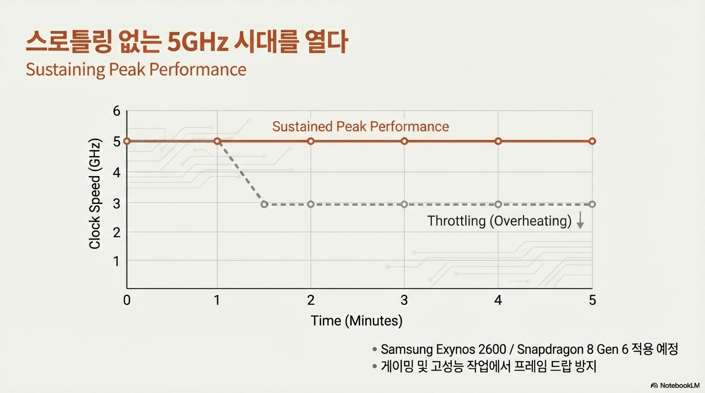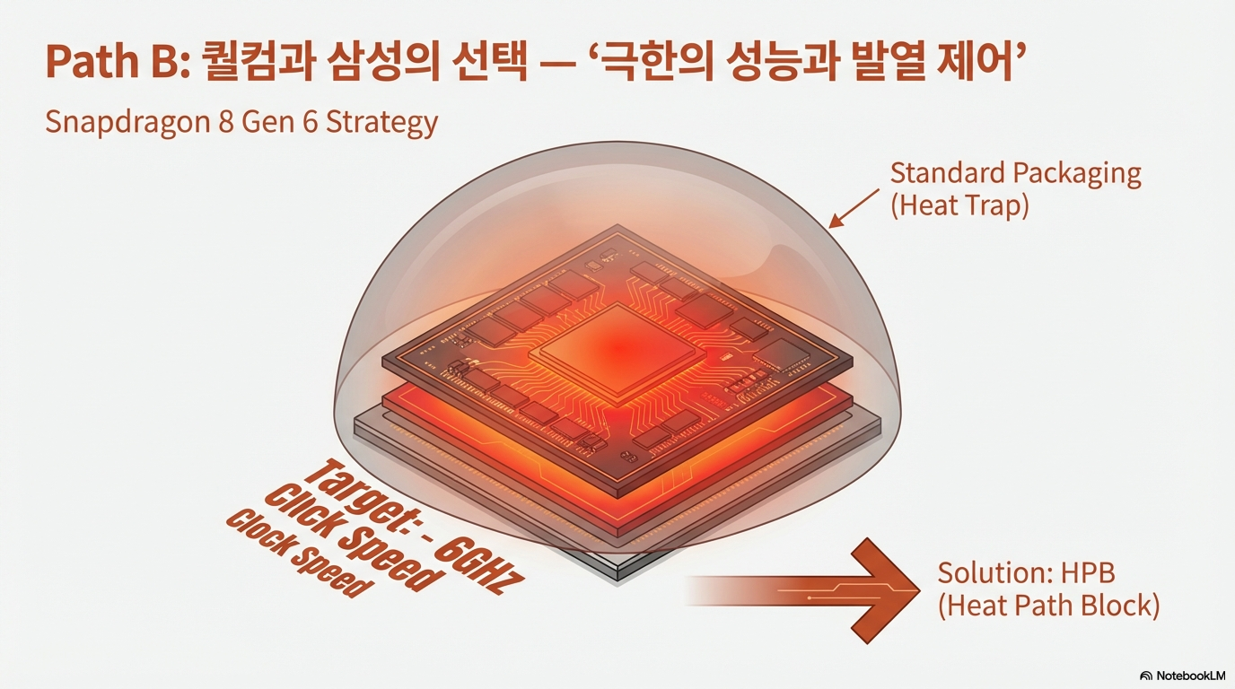 퀄컴은 스냅드래곤 8 Gen 6에서 5GHz 이상의 극단적인 클럭 속도를 목표로 한다는 루머가 있습니다. 이처럼 압도적인 최고 속도를 달성하는 데 가장 큰 걸림돌인 '발열' 문제를 정면으로 돌파하기 위해, 삼성 엑시노스 2600에 도입된 HPB(Heat Path Block) 기술을 채택할 것으로 예상됩니다.