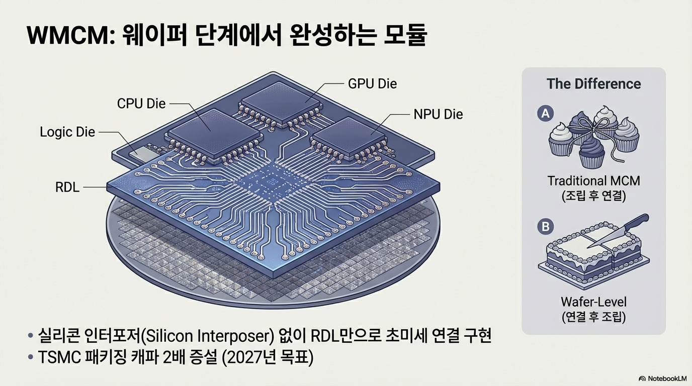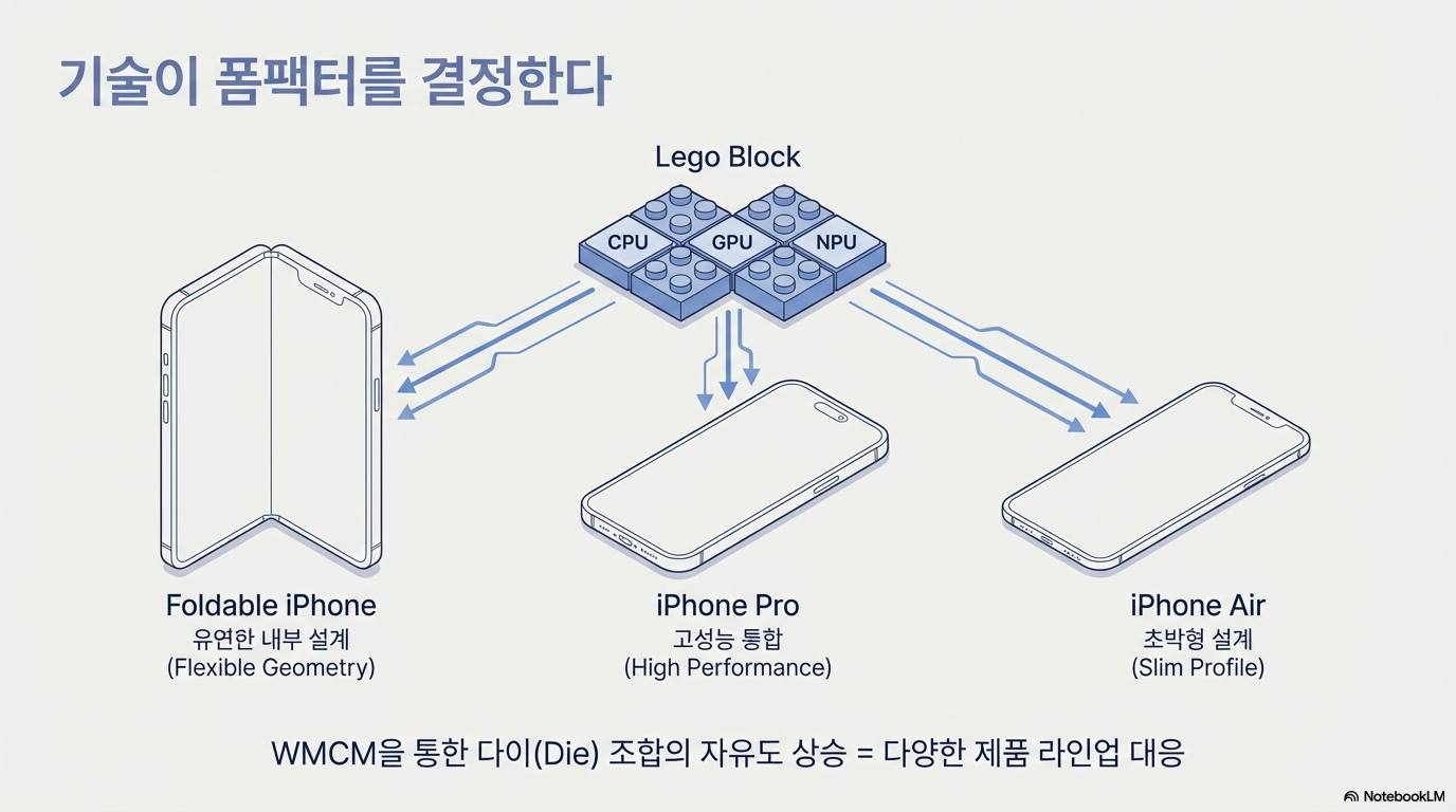 • WMCM (Wafer-Level Multi-Chip Module): 이는 모바일 칩렛(Chiplet) 아키텍처에 대한 애플의 해답입니다. 거대하고 복잡한 2나노 SoC 하나를 통째로 만드는 대신, CPU, GPU 등 각기 다른 기능을 가진 전문 칩렛들을 RDL을 이용해 웨이퍼 상태에서 미리 옆으로 나란히 연결하는 방식입니다. 작은 칩렛은 개별 생산 수율(Yield)을 높이는 데 유리하며, 향후 폴더블 아이폰과 같이 다양한 기기에 맞춰 칩 조합을 유연하게 변경할 수 있는 장점까지 제공합니다.