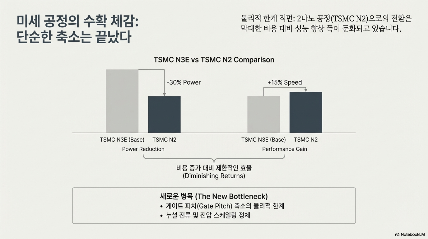 7나노에서 5나노, 5나노에서 3나노로 전환될 때마다 우리는 놀라운 성능 향상을 경험했습니다. 하지만 3나노에서 2나노로의 전환은 예전만큼 극적인 도약을 약속하지 못합니다. 반도체 회로의 선폭을 줄이는 물리적 한계에 가까워지면서 "점점 더 개선폭이 줄어드는 형태"가 나타나고 있기 때문입니다. 회로가 미세해질수록 제어하기 힘든 ‘누설 전류(leakage current)’가 증가하고, 더 높은 클럭 속도를 추구할수록 감당하기 힘든 ‘열(heat)’이 발생합니다. 이제 단순히 공정을 미세화하는 것만으로는 성능을 끌어올리는 데 한계가 명확해졌습니다.