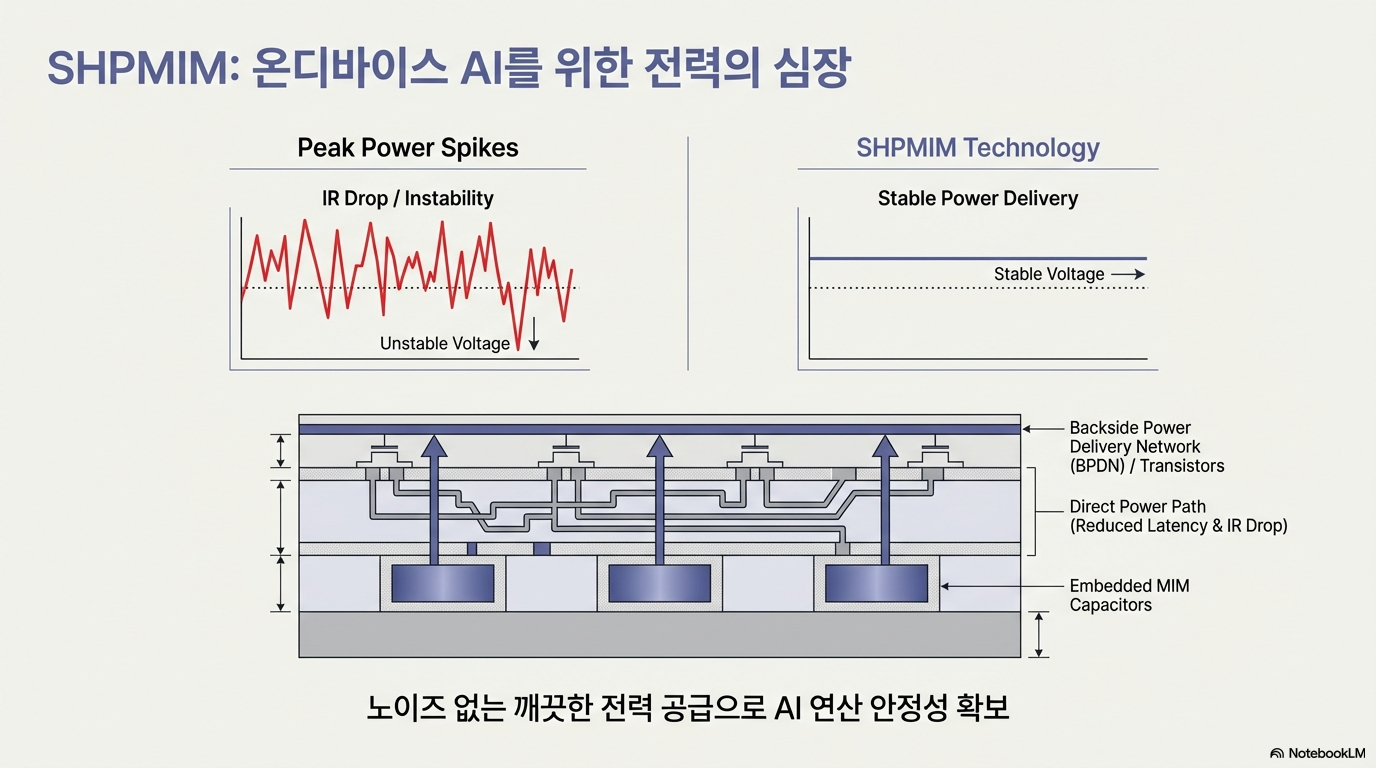 • SHP-MIM (Super High-Performance Metal-Insulator-Metal): 이는 칩의 전력 공급망(Power Delivery Network)에 고성능 커패시터(Capacitor)를 직접 추가하는 기술입니다. 쉽게 말해 ‘전력 안정 장치’와 같습니다. 칩이 최대 성능을 낼 때 순간적으로 전압이 떨어지는 ‘IR 드롭’ 현상을 방지하여, 온디바이스 AI처럼 지속적이고 안정적인 성능이 요구되는 작업에서 결정적인 역할을 합니다.
