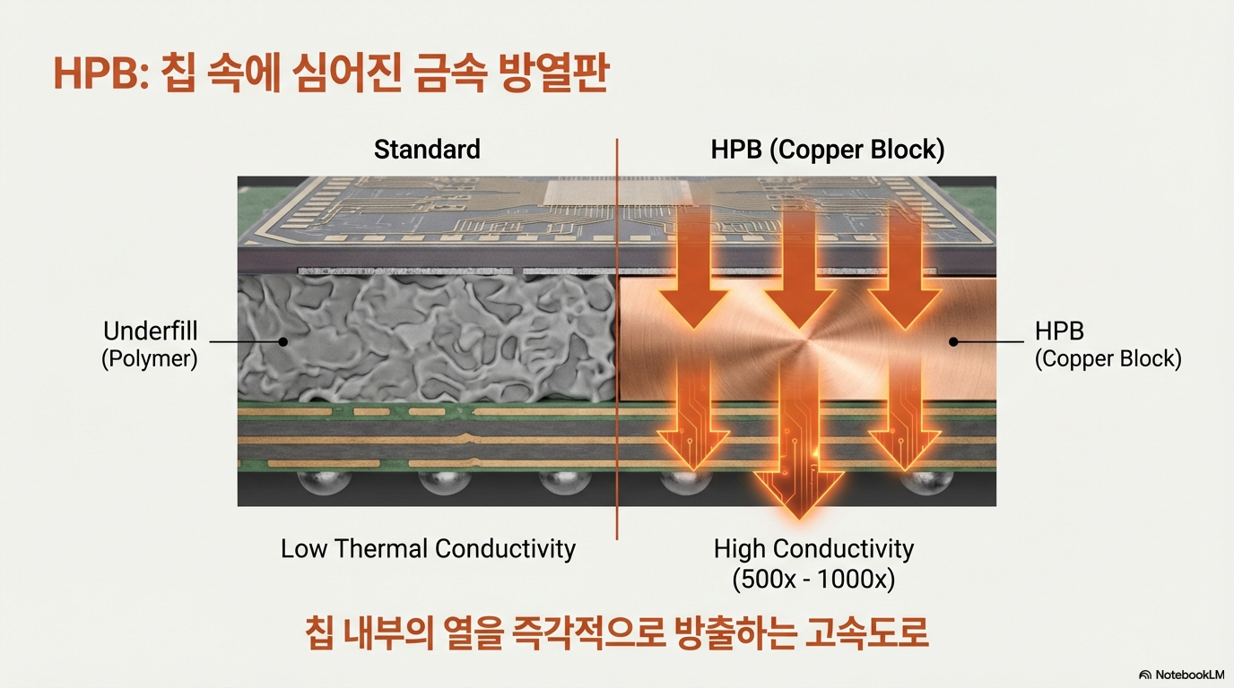 • HPB란? 간단히 말해, 칩 패키지 내부에 구리로 만든 작은 블록, 즉 **‘초소형 방열판’**을 직접 집어넣는 기술입니다.