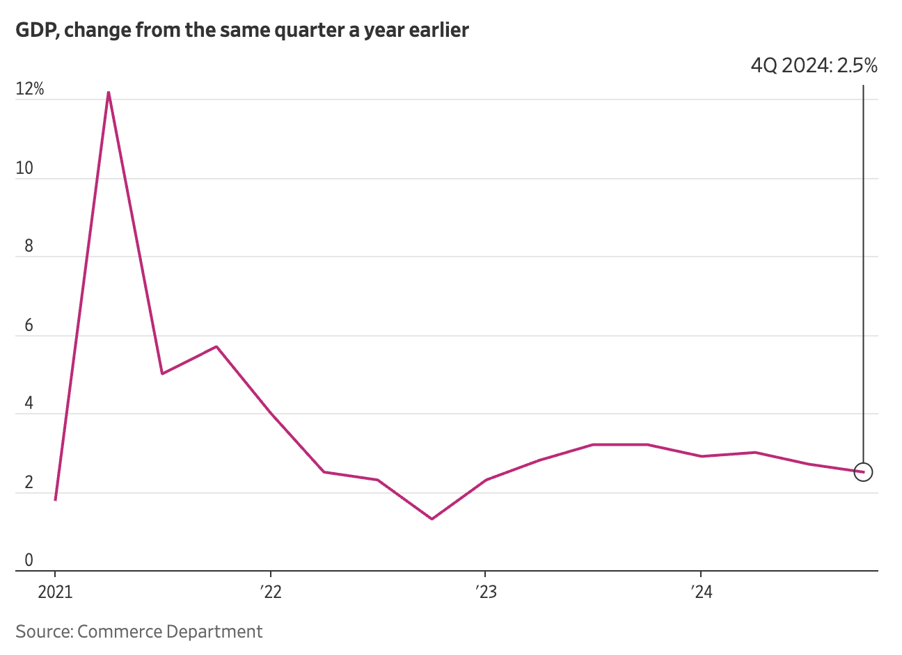 2024년 미국 경제는 소비자 지출 증가에 힘입어 2.5% 성장하며 탄탄한 성과를 기록했습니다. 하지만 이는 2023년 3.2% 성장보다 둔화된 수치이며, 4분기 성장률이 예상보다 낮아지면서 경제에 대한 불확실성이 커지고 있습니다.