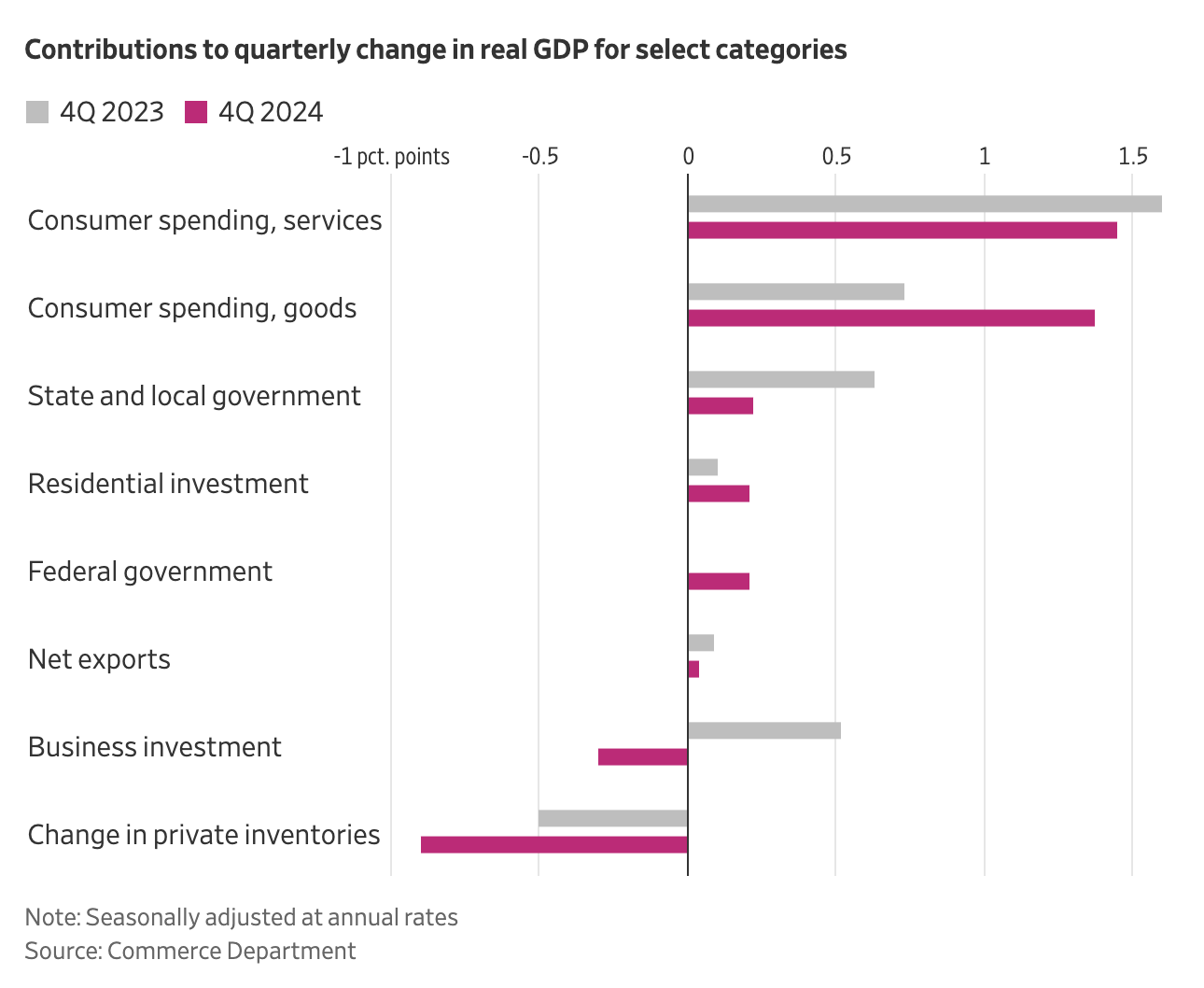 2023년까지는 공급망 불안정으로 인해 기업들이 재고를 축적하는 경향이 강했지만, 2024년에는 재고를 줄이며 수입을 늘리는 방식으로 변화 했습니다. 이는 연간 성장에는 긍정적으로 작용했으나, 4분기에는 재고 감소가 GDP 성장률을 낮추는 요인으로 작용했습니다.