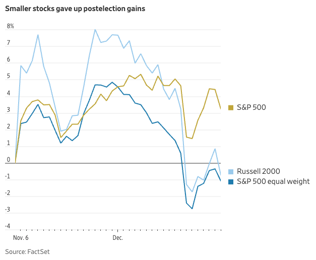 트럼프 전 대통령의 재선은 주식 시장과 비트코인에 강한 영향을 미쳤습니다. 감세와 규제 완화에 대한 기대감이 커지면서 시장은 일시적으로 상승했지만, 고금리 환경에서 중소형주 중심의 Russell 2000 지수와 동등가중 S&P 500 지수는 결국 모든 상승분을 반납했습니다.