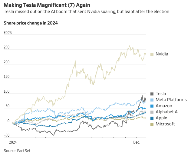 2024년은 인공지능(AI)이 기술 혁신의 중심에 자리 잡으며 시장을 이끈 해였습니다. 연초만 해도 AI 관련 주식은 기술 발전과 기대감을 반영하며 안정적인 상승세를 보였지만, 중반 이후로 시장은 AI 과열 현상에 휩싸이기 시작했습니다. 특히 AI 기술에 대한 투자가 급증하면서 관련 기업들의 주가는 과도하게 상승했습니다. 대표적으로 상위 10개 기술 기업이 S&P 500의 전체 가중치의 3분의 1 이상을 차지하며 시장의 전반적인 상승세를 주도했습니다.