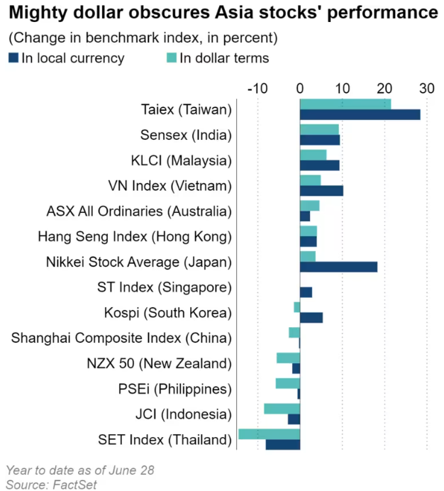 인도의 주식 시장은 외환 시장의 영향을 덜 받으며 안정적인 성장을 보였습니다. 센섹스 지수는 현지 통화와 달러 기준으로 약 9% 상승했습니다. 인도의 루피는 아시아에서 가장 안정적인 통화 중 하나로 중앙은행의 개입 덕분에 큰 변동이 없었습니다.