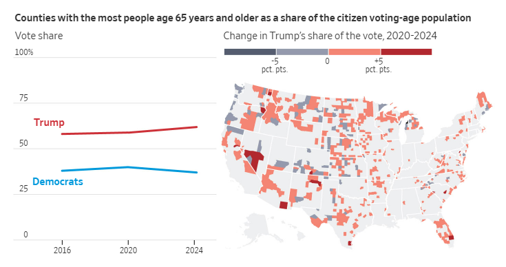 트럼프 전 대통령은 미국 내 고령층 유권자들 사이에서도 여전히 강력한 지지를 받고 있습니다. 65세 이상의 인구가 많은 카운티에서는 트럼프가 이번 선거에서 62%의 득표율을 기록했으며, 이는 카말라 해리스 후보와의 격차를 25%p로 벌리는 결과를 낳았습니다. 이는 2020년 대선 당시 바이든 대통령과의 격차인 19%p보다 크게 증가한 수치입니다.