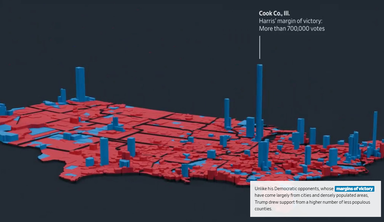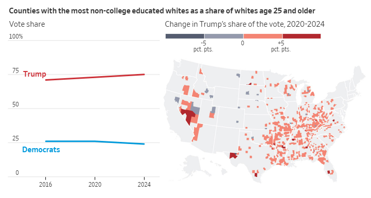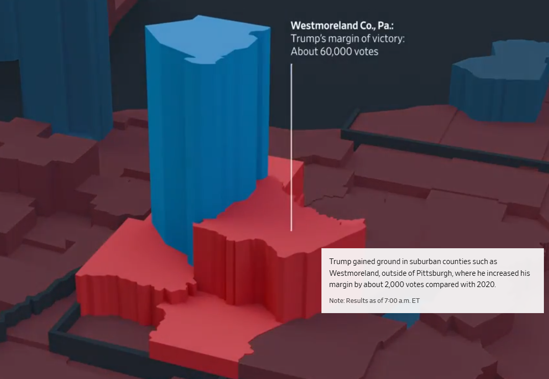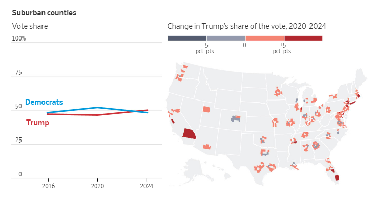 교외 지역은 그동안 공화당과 민주당이 가장 치열하게 경쟁하는 격전지였습니다. 2016년 대선에서 트럼프는 힐러리 클린턴과 거의 동률을 이루며 교외 지역 유권자들에게 강한 지지를 얻었으나, 2020년에는 조 바이든 대통령에게 뒤지면서 지지층이 약화되었습니다. 그러나 이번 선거에서 트럼프는 교외 지역에서 다시 지지율을 회복하며 50.1%의 득표율을 기록했고, 이는 4년 전보다 증가한 수치입니다.
