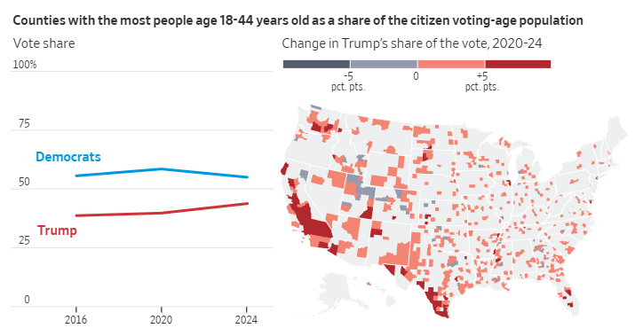 젊은층 유권자는 전통적으로 민주당에 대한 지지가 강한 그룹으로 분류되어 왔습니다. 그동안 공화당 후보들이 젊은층 사이에서 높은 득표율을 기록하기 어려웠던 이유는 진보적 사회 정책에 대한 선호와 가치관 차이에 있었습니다. 그러나 이번 선거에서 트럼프 전 대통령은 젊은 유권자가 많은 카운티에서 민주당과의 격차를 2020년의 -19%p에서 -11%p로 줄이며 눈에 띄는 변화를 보였습니다.