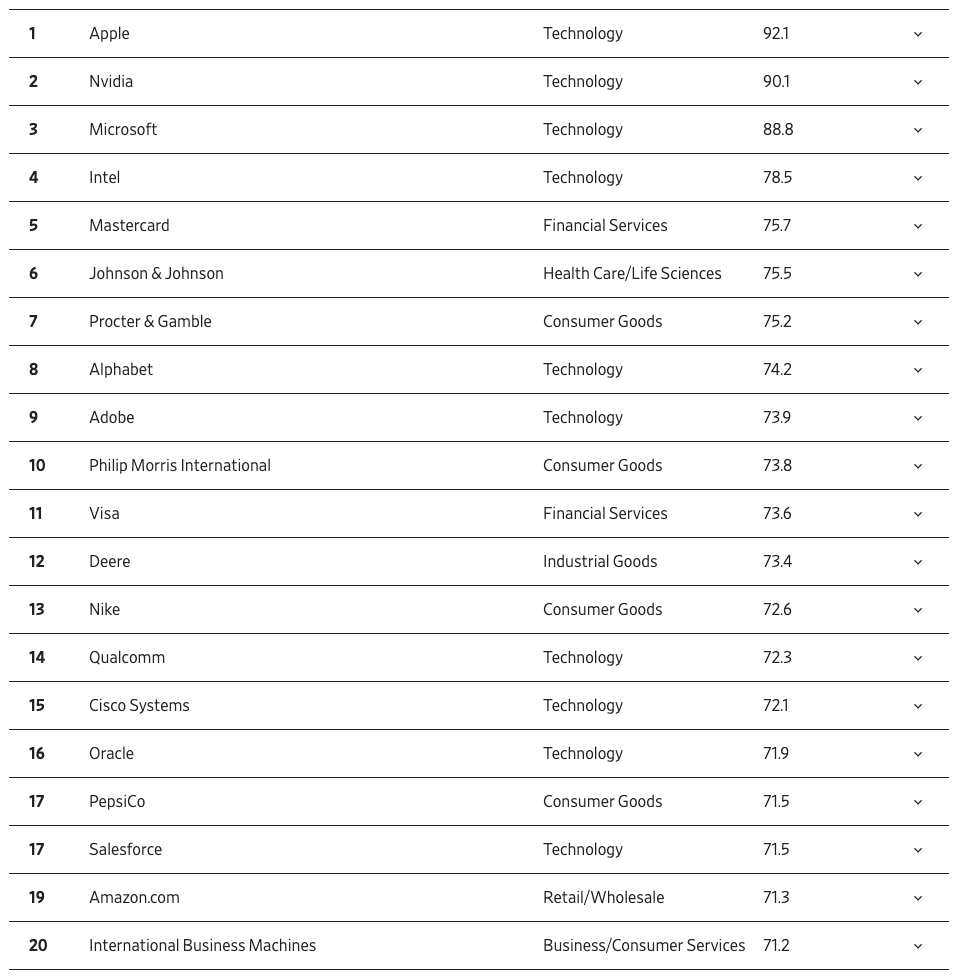 애플은 특히 고객 만족과 재정적 강점에서 두각을 나타내며 **올스타(all-star)**로 선정된 유일한 기업이 되었습니다. 반면, Alphabet은 8위로 떨어졌고, Adobe는 9위로 상승하며 기술 기업들 간의 경쟁이 여전히 치열함을 보여줍니다.