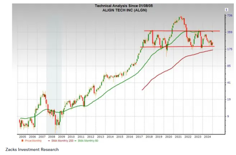 ALGN의 주가는 2021년 최고가 대비 70% 하락한 상태로, 현재 26.4배의 선행 주가수익비율(P/E)로 거래되고 있어 과거 15년 중 가장 저렴한 수준에 가깝습니다. 또한, Zacks의 평균 목표가 대비 25% 낮은 가격에 거래 중이며, 13개의 브로커리지 평가 중 9개가 "매우 매수"로 평가하고 있습니다.
