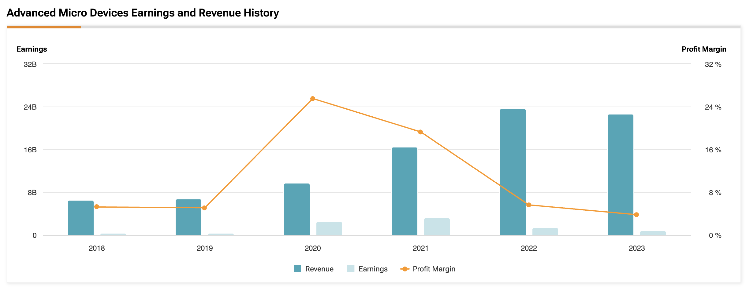부채비율 역시 안정적입니다. 2018년 이후 꾸준히 부채를 관리하며, 자산 대비 부채 비율을 줄여 왔습니다. 이는 AMD가 경기 변동이나 산업 내 충격에도 재정적 안정성을 유지할 수 있음을 보여줍니다.