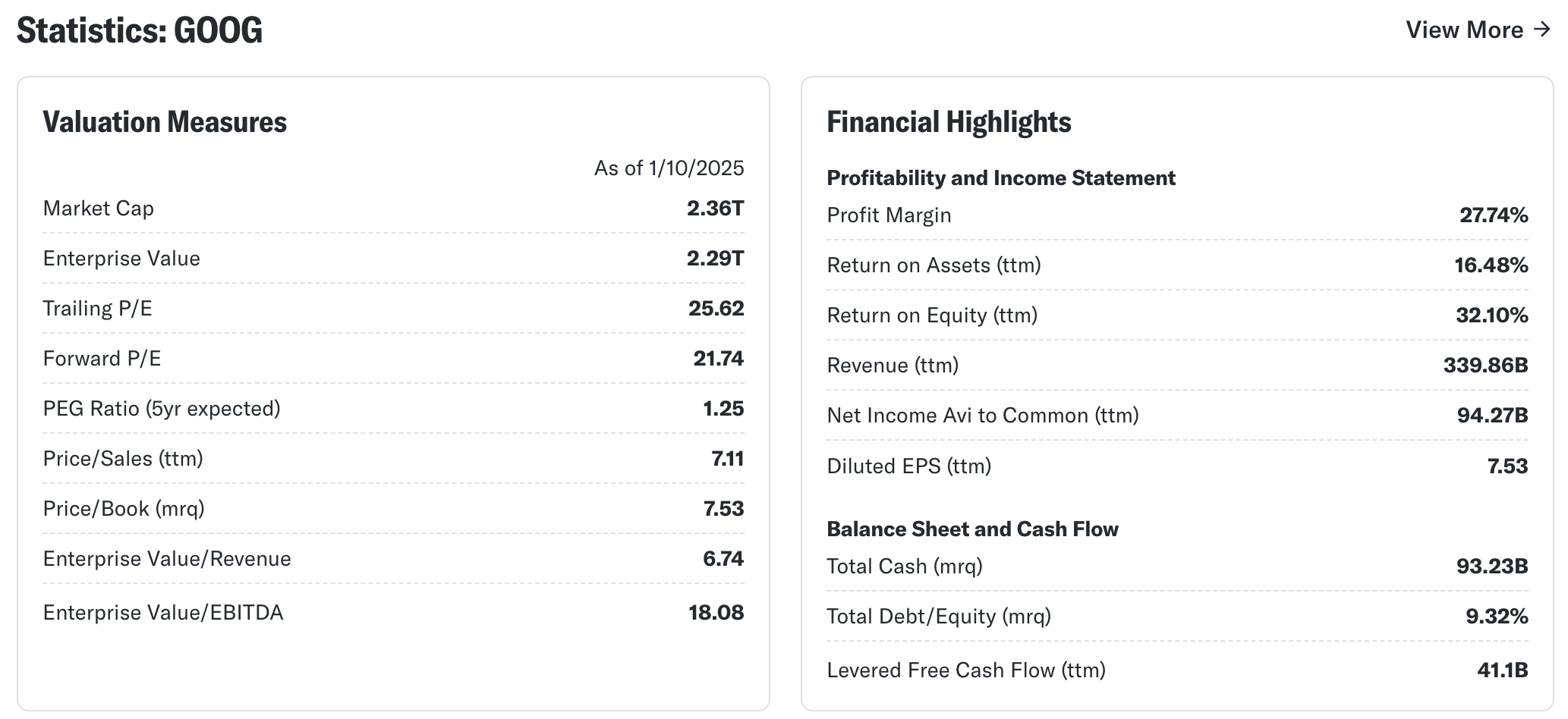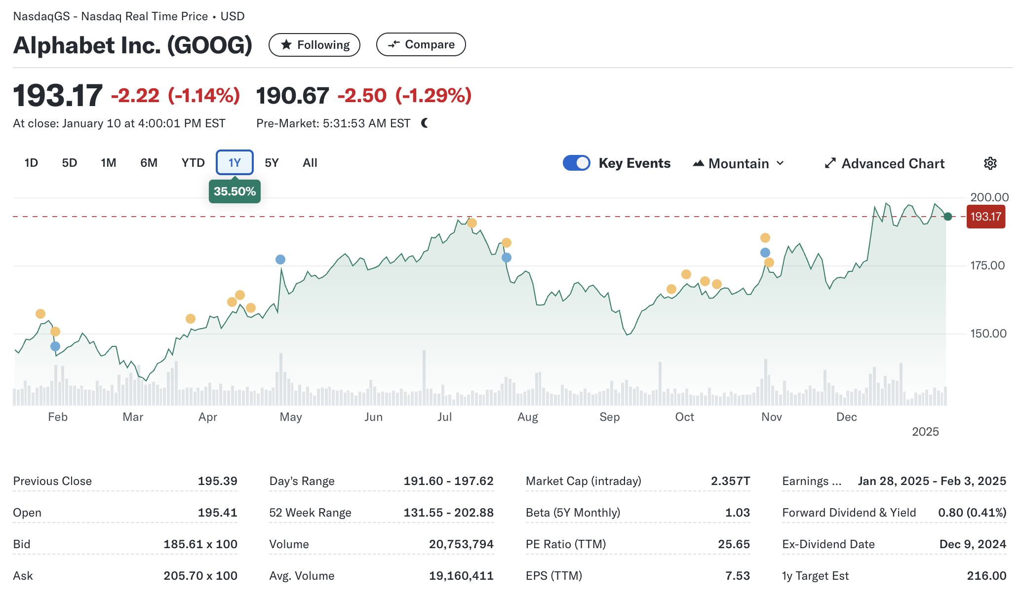 현재 알파벳의 주가는 12개월 기준 주당 순이익(EPS) $7.54에 대해 주가수익비율(P/E) 25.7배로 거래되고 있습니다. 이는 Apple(31.8), Nvidia(90.4), Microsoft(35)보다 낮은 수준입니다.