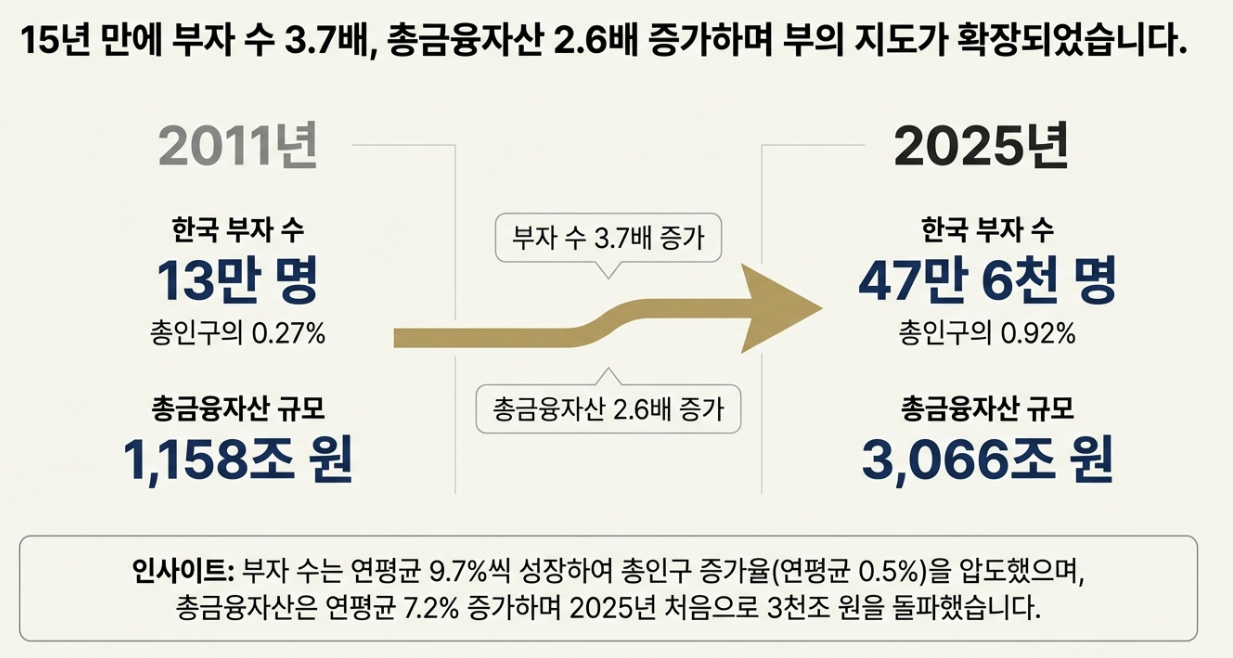 보고서에 따르면, 2011년에 금융자산 10억 원 이상 보유자는 13만 명이었는데, 2025년에는 47만 6천 명으로 증가했습니다. 즉 15년 동안 3배 이상 성장했고, 연평균 증가율은 9.7% 수준으로 제시됩니다