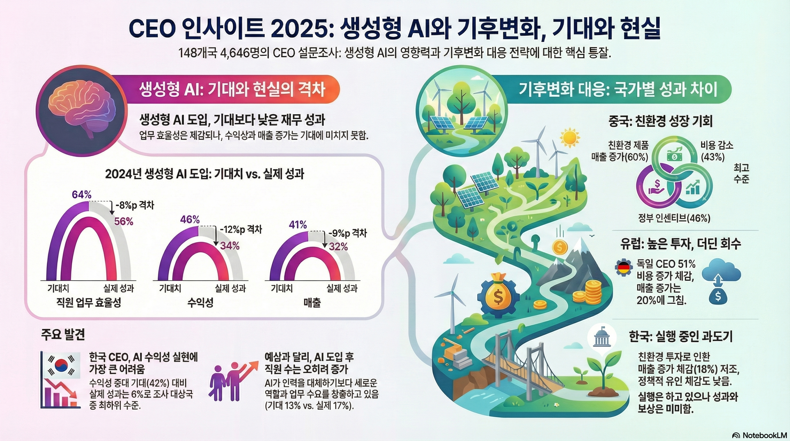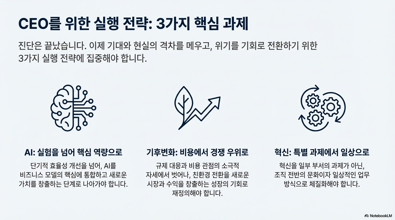 • 수익성: 글로벌 CEO의 46%가 수익성 증가를 기대했지만, 단 34%만이 실제로 성과를 경험했습니다.