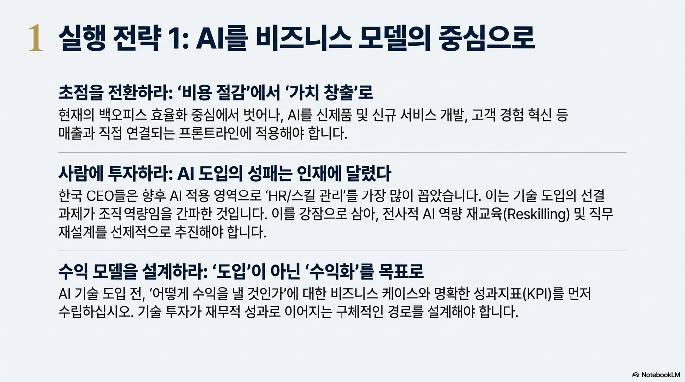 4,646명 글로벌 리더들의 목소리는 우리에게 중요한 사실을 일깨워줍니다. AI의 진정한 영향력은 단순 자동화나 즉각적인 수익 창출이 아닌, 비즈니스의 근본적인 재편에 있다는 것. 그리고 혁신은 전략 보고서가 아닌 과감한 실행으로 증명되어야 한다는 것입니다.