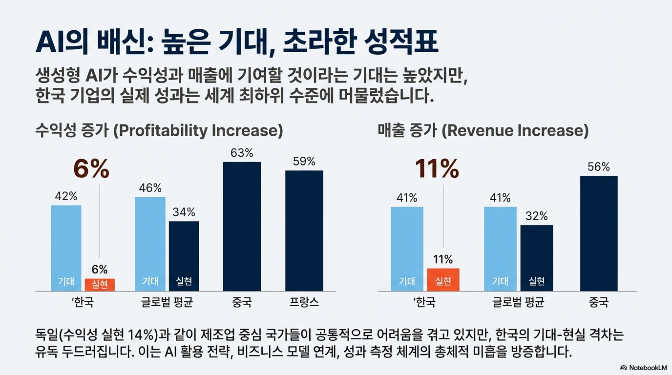 이 격차는 한국에서 특히 충격적인 수준으로 나타났습니다. 한국 CEO들은 수익성 증가에 대해 42%라는 높은 기대치를 보였지만, 실제 성과를 거뒀다고 응답한 비율은 고작 6%에 불과했습니다. 이러한 실망스러운 결과는 단순히 기술 도입의 문제를 넘어, AI를 활용해 비즈니스 모델을 근본적으로 바꾸려는 혁신 실행력의 부재와 깊은 관련이 있을 수 있습니다.