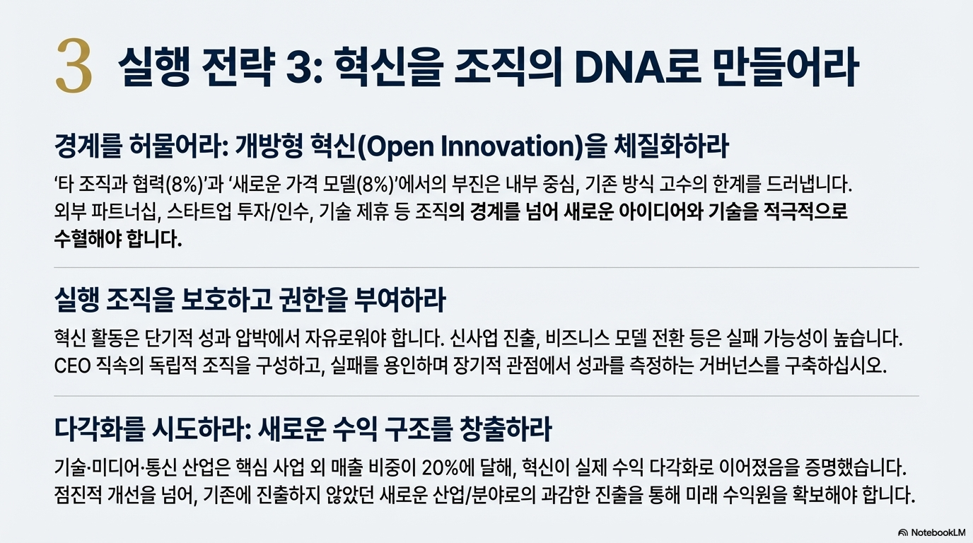 보고서는 오늘날의 경영 환경에서 혁신은 더 이상 선택이 아닌 "생존을 위한 전제 조건"이라고 단언합니다. 변화의 속도가 예측을 무의미하게 만드는 시대에, 혁신 없이는 살아남을 수 없다는 뜻입니다.
