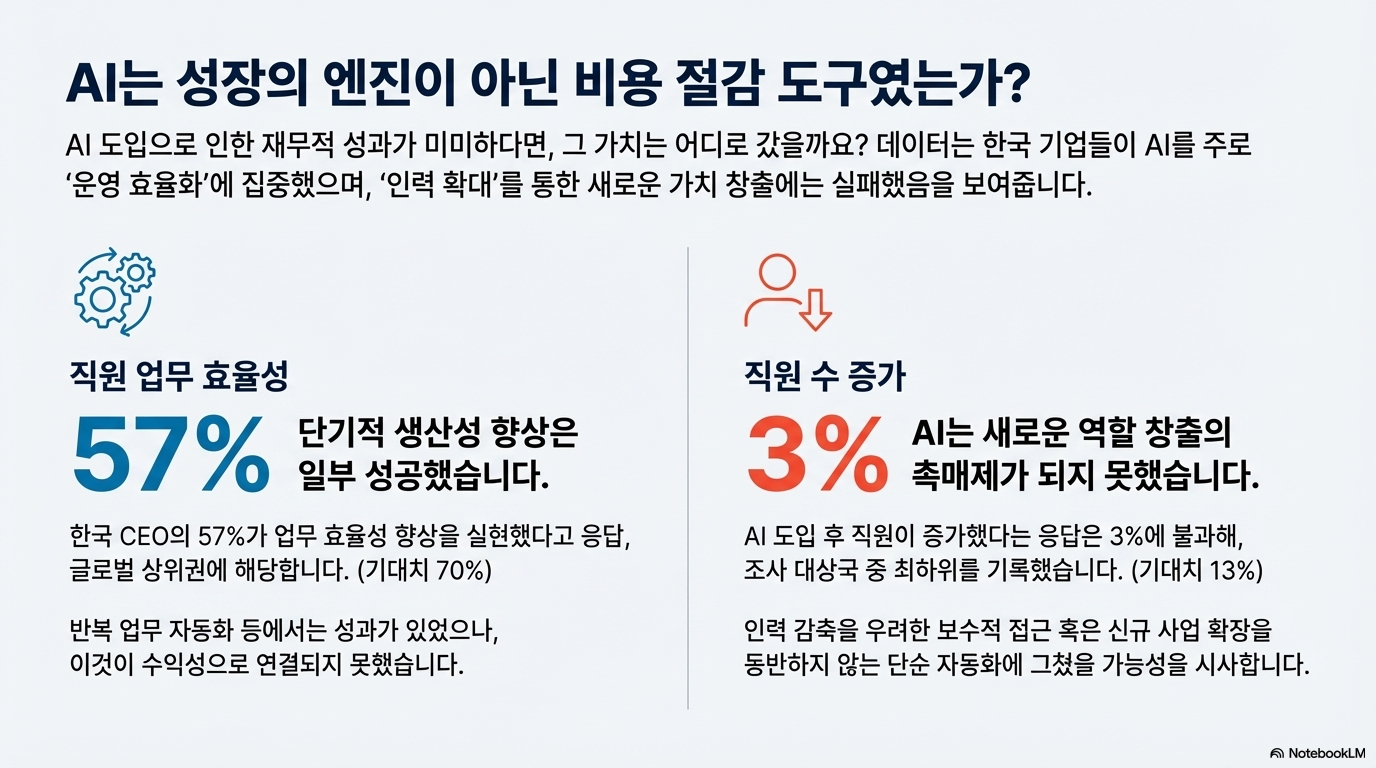 하지만 서베이 결과는 정반대의 현실을 보여주었습니다. 글로벌 CEO들은 생성형 AI 도입 후 직원 수가 증가할 것이라는 '기대치'가 13%에 불과했지만, '실제' 직원 수가 증가했다고 응답한 비율은 그보다 높은 17%에 달했습니다. 이는 AI가 일자리를 없애기보다는 오히려 새로운 수요를 창출하며 인력 확대를 이끌고 있다는 강력한 증거입니다.