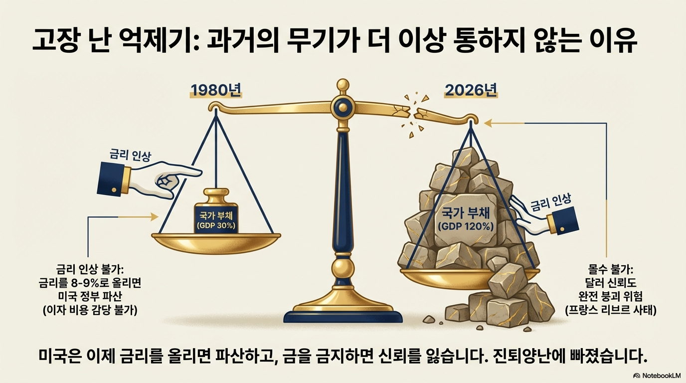• 초고금리 정책 불가: 폴 볼커 시절 미국의 GDP 대비 국가부채 비율은 30%에 불과했습니다. 그러나 지금은 120%를 초과합니다. 만약 금값을 잡기 위해 금리를 공격적으로 인상하면, 미국 정부는 천문학적인 이자를 감당하지 못해 국채 시장 자체가 붕괴될 수 있습니다.
