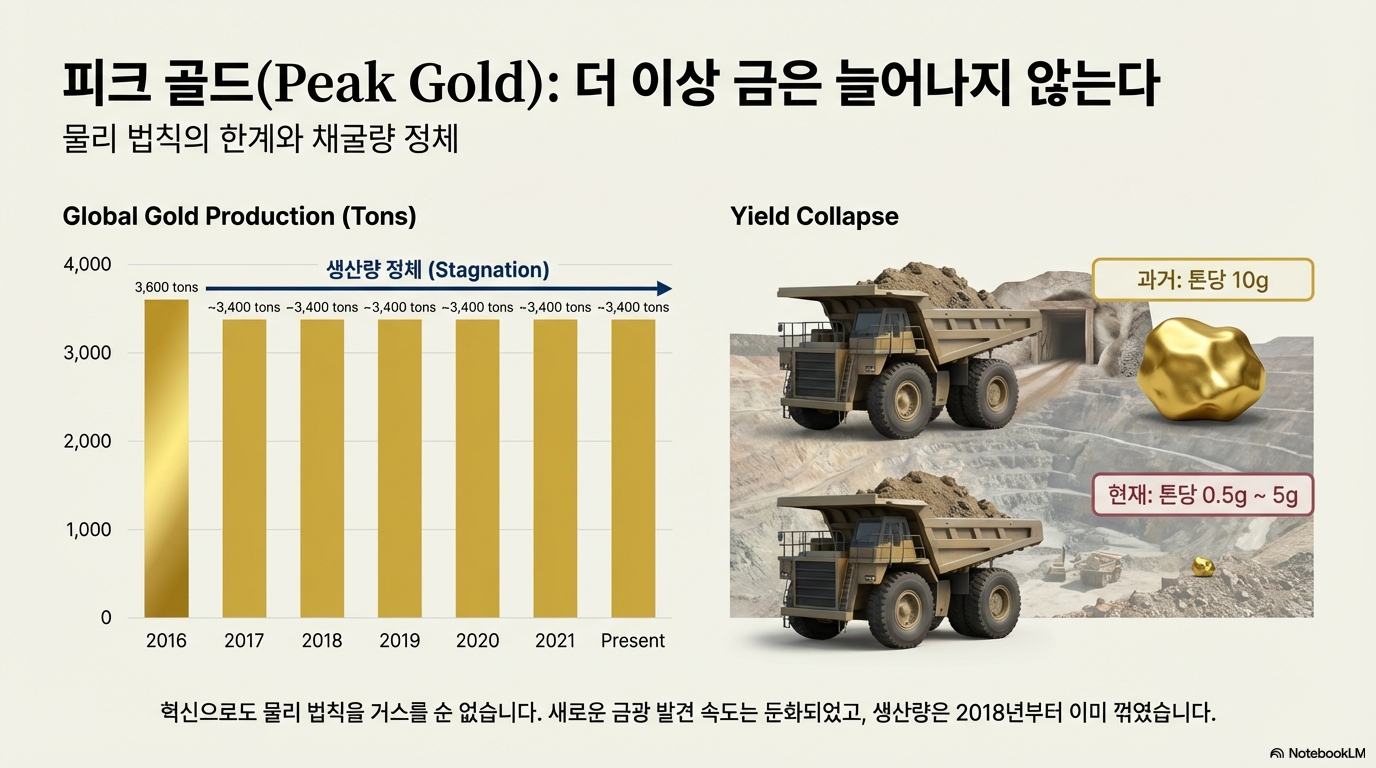 첫째, 피크 골드(Peak Gold) 현상입니다. 2018년 이후 전 세계 금 생산량은 정체 상태에 들어갔고, 공급은 더 이상 수요를 따라가지 못하게 되었습니다.