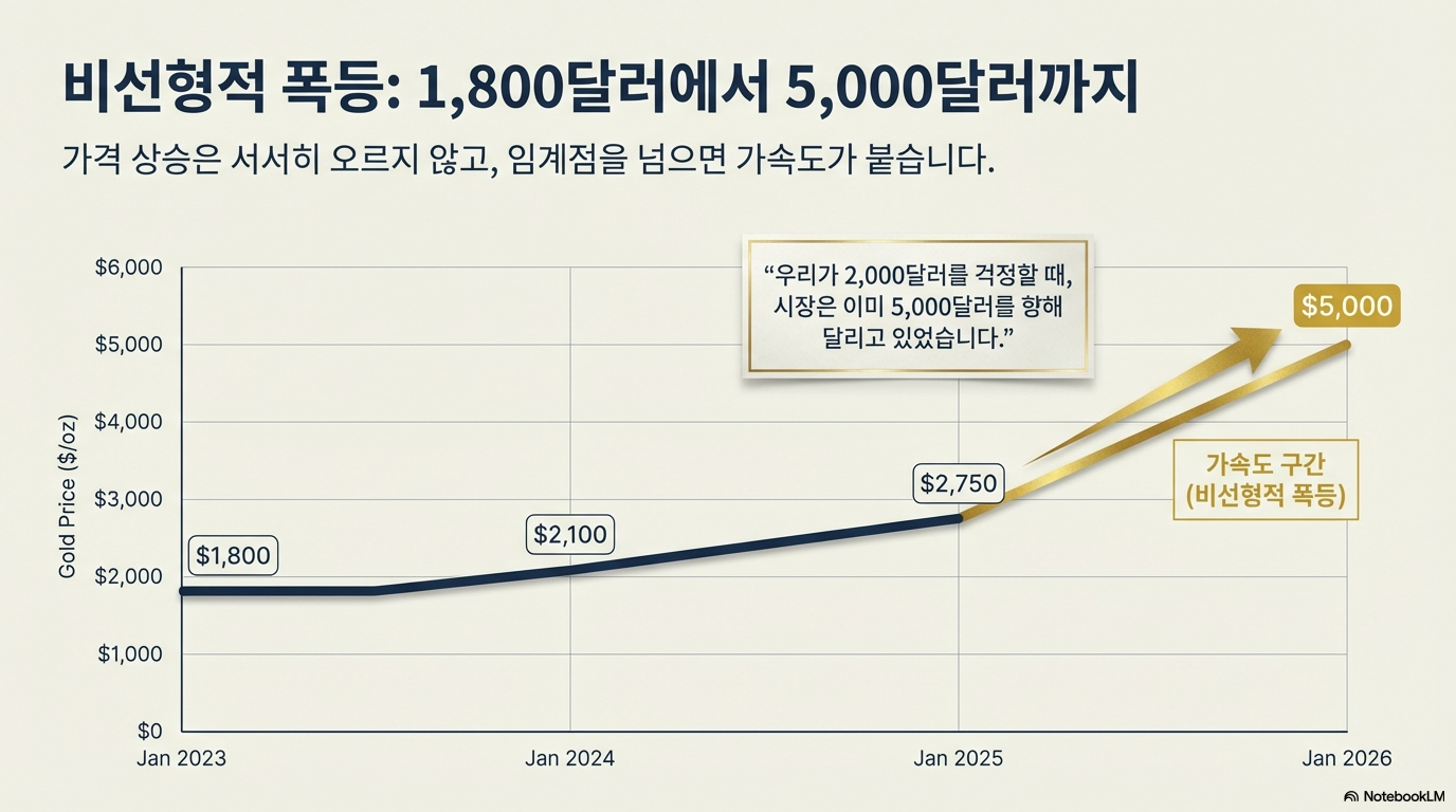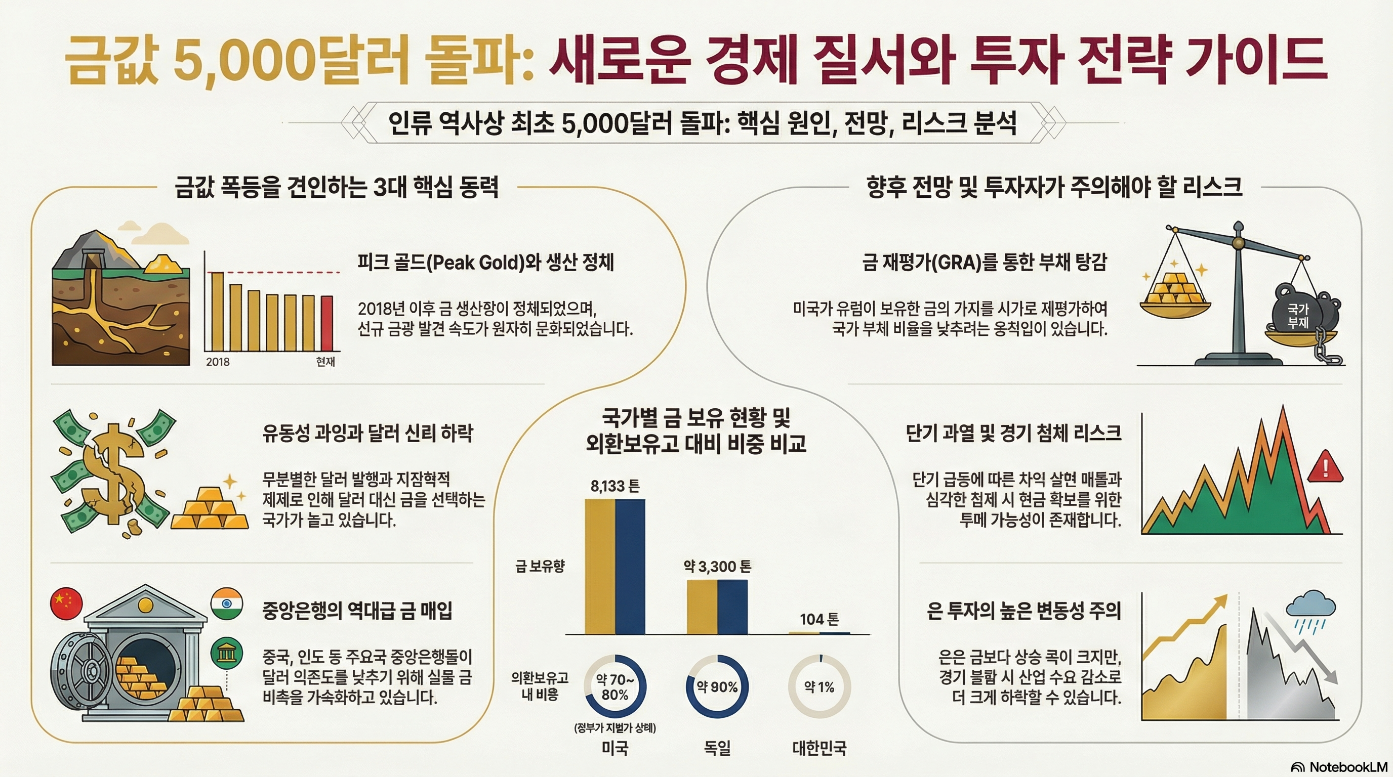 2026년 1월, 마침내 금값이 트로이온스당 5,000달러를 돌파했다고 가정해 봅시다. 세상은 어떻게 변할까요? 이 역사적인 순간을 마주한 많은 이들이 비슷한 질문을 던질 것입니다. "지금이라도 금을 사야 할까?", "곧 폭락하는 것은 아닐까?" 하지만 이러한 단기적인 투자 관점만으로는 이 가상 시나리오의 본질을 파악할 수 없습니다.