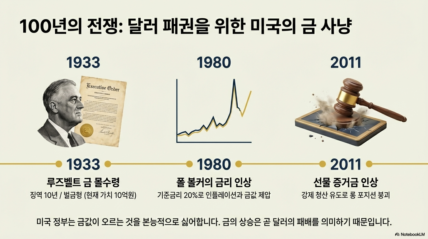 지난 100년간 미국은 달러 패권을 지키기 위해 금과 전쟁을 벌여왔습니다. 1933년, 루즈벨트 대통령은 개인의 금 소유를 금지하는 '금 소유 금지령'이라는 초강수를 두었고, 1980년 폴 볼커 연준 의장은 기준금리를 20%까지 올리는 초고금리 정책으로 금값을 20년간 짓눌렀습니다. 이는 수십 년간 금을 '야만적 유물'로 취급하도록 가르쳐 온 주류 경제학의 관점에서는 당연한 일이었습니다. 미국에게 금은 달러 패권에 도전하는 가장 위협적인 적이었습니다.