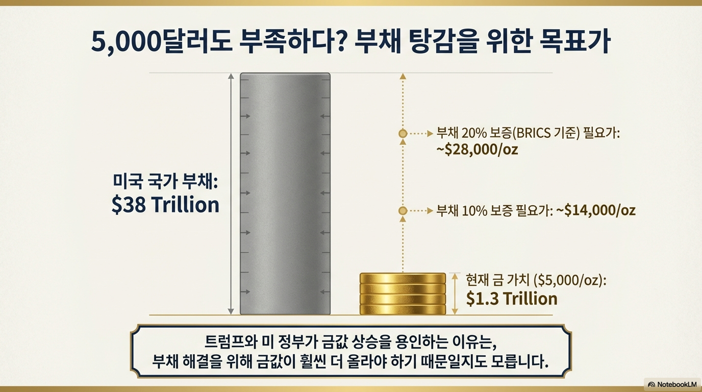 물론 1조 3천억 달러는 38조 달러에 달하는 미국의 총부채를 감당하기엔 턱없이 부족합니다. 하지만 발상을 전환하면 이야기가 달라집니다. 미국이 부채의 일부, 가령 10%만이라도 금으로 보증하겠다고 선언한다면 어떨까요? 이를 위해서는 금값이 온스당 14,000달러가 되어야 합니다. 20%를 보증하려면 28,000달러가 필요합니다. 적을 없앨 수 없다면, 그 힘을 이용해 자신의 부채 문제를 관리하려는 미국의 대담한 발상 전환이 시작된 것입니다.