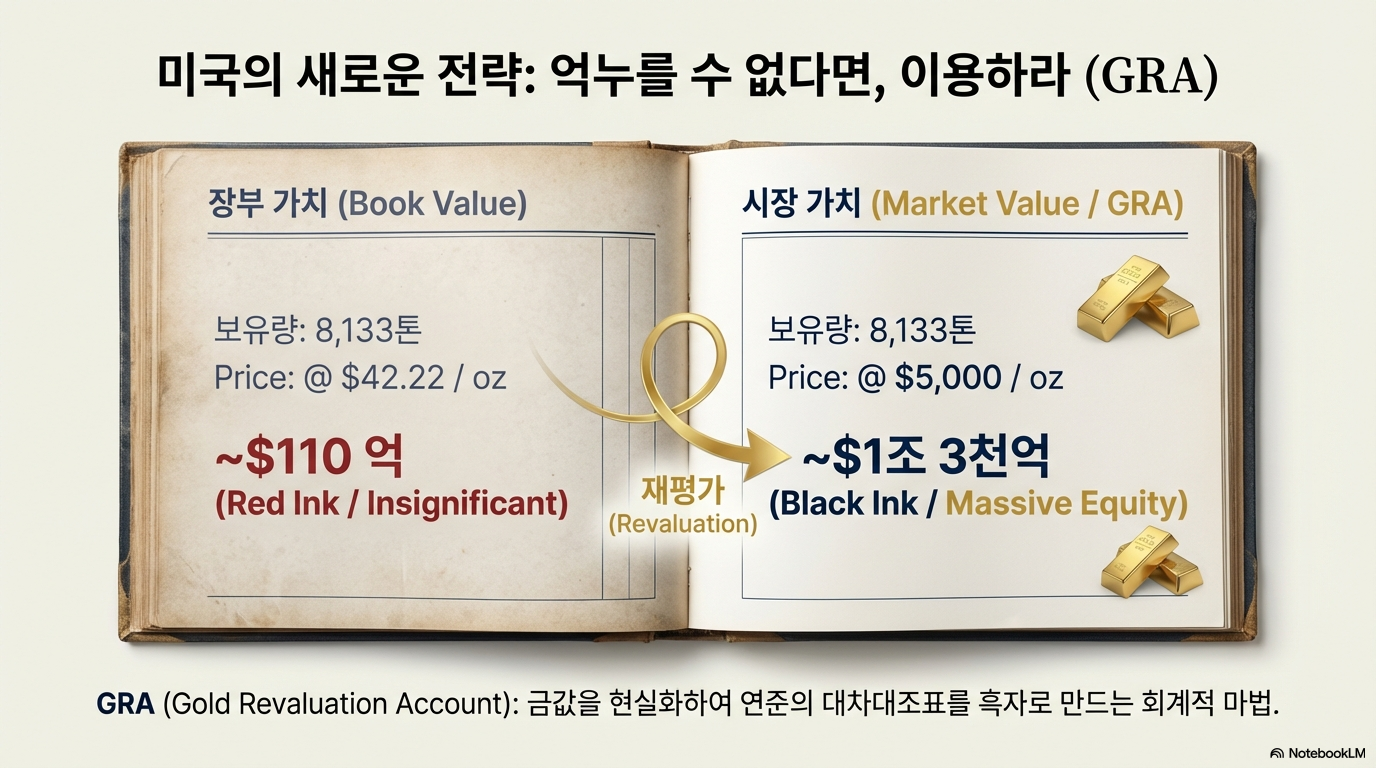 상황이 이렇게 되자, 미국은 놀랍도록 창의적인 전략을 구상하기 시작했습니다. 바로 '금 재평가(Gold Revaluation)'입니다. 미국은 전 세계에서 가장 많은 8,133톤의 금을 보유하고 있습니다. 놀라운 사실은 이 금의 장부가가 1온스당 고작 42.22달러로 기록되어 있다는 점입니다. 이를 현재 시가인 5,000달러로 재평가하면 그 가치는 1조 3천억 달러로 무려 115배나 폭증합니다.