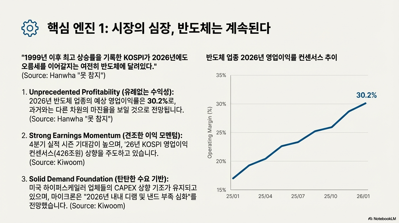1999년 이후 최고 상승률(+75.6%)을 기록한 2025년 KOSPI의 절대적인 동력이 반도체였음은 누구도 부정할 수 없습니다. 2025년 한 해에만 159.0%라는 경이적인 상승률을 기록했고, 2026년에는 유례없는 30.2%의 영업이익률이 전망되는 등 시장의 기대감은 최고조에 달해 있습니다. 하지만 이러한 장밋빛 전망 이면에는 반드시 인지해야 할 리스크가 존재합니다.