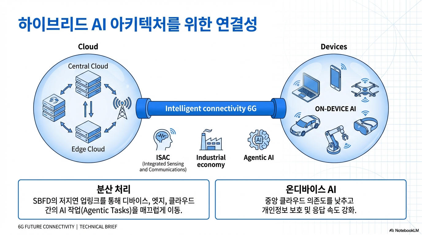 먼저, AI는 6G 기술을 가장 필요로 하는 핵심 '사용자'입니다. 사용자의 기기, 네트워크 엣지, 중앙 클라우드를 넘나들며 유기적으로 작동하는 하이브리드 AI 및 에이전틱 AI는 방대한 데이터를 지연 없이 주고받아야 합니다. 이를 위해서는 6G가 제공하는 초저지연, 초고용량 특성이 선택이 아닌 필수입니다.