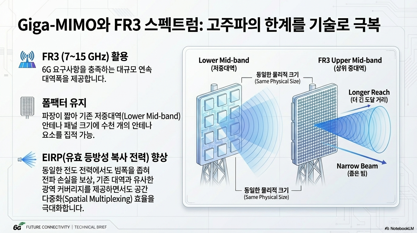 5G의 핵심 기술인 '매시브 MIMO(Massive MIMO)'가 수백 개의 안테나를 사용했다면, 기가-MIMO는 그 수를 수천 개 단위로 늘려 데이터 용량을 폭발적으로 증가시킵니다. 이 기술은 7~15GHz 사이의 '상위-중대역', 즉 FR3(Frequency Range 3) 스펙트럼을 활용하여 전례 없는 광대역 채널을 확보합니다.