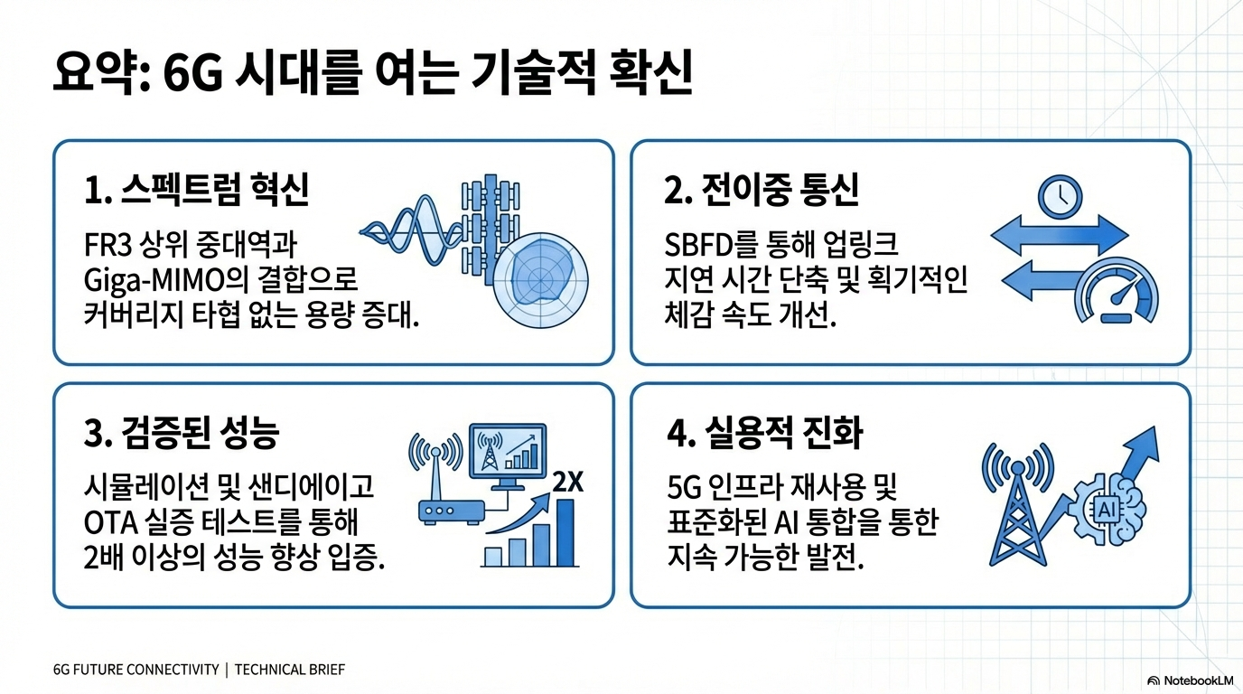 기가-MIMO의 압도적인 용량, SBFD의 초저지연 양방향 통신, ISAC의 환경 감지 능력, 그리고 AI와의 깊은 융합. 이 4가지 핵심 변화는 6G가 단순한 속도 경쟁을 넘어 네트워크의 '지능화'와 '감각화'를 추구하는 기술임을 명확히 보여줍니다.