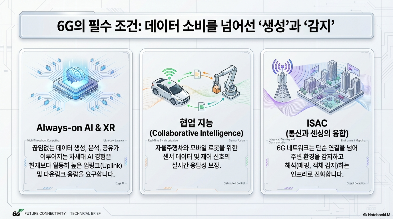 우리는 이제 막 5G 시대에 익숙해졌지만, 기술의 지평선 너머에서는 이미 다음 세대를 향한 거대한 물결이 밀려오고 있습니다. 끊임없이 데이터를 생성하고 분석하는 '상시 접속 AI(always-on AI)', 현실과 가상을 완벽히 융합하는 '몰입형 XR', 그리고 도로 위를 달리는 데이터 센터 '자율주행차'는 현재의 네트워크가 감당하기 어려운 수준의 성능을 요구하며 임박한 '데이터 병목 현상'을 예고합니다.
