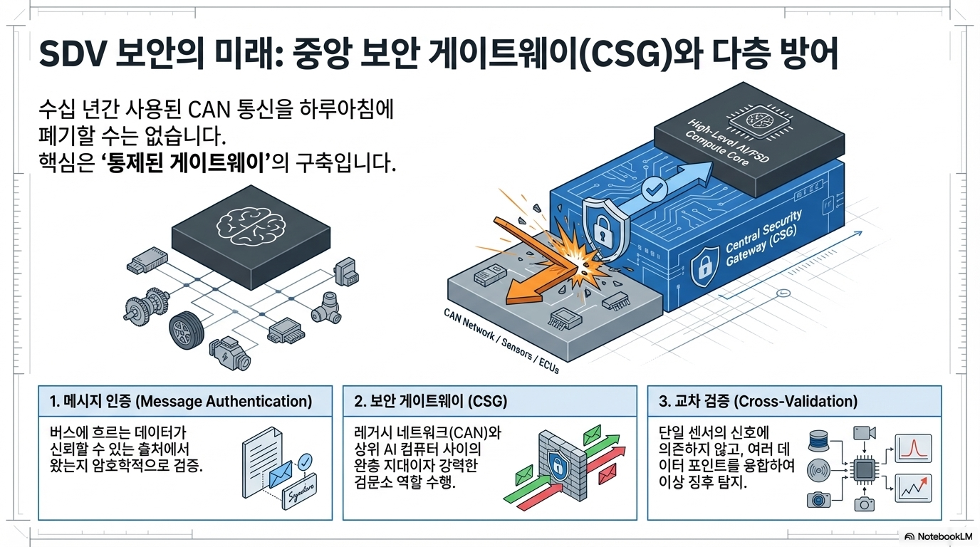 - 중앙 게이트웨이(Central Gateway) 강화: 외부 통신망과 내부 CAN 통신망 사이에서 데이터를 검문하는 '디지털 방화벽'을 더욱 견고하게 구축해야 합니다.