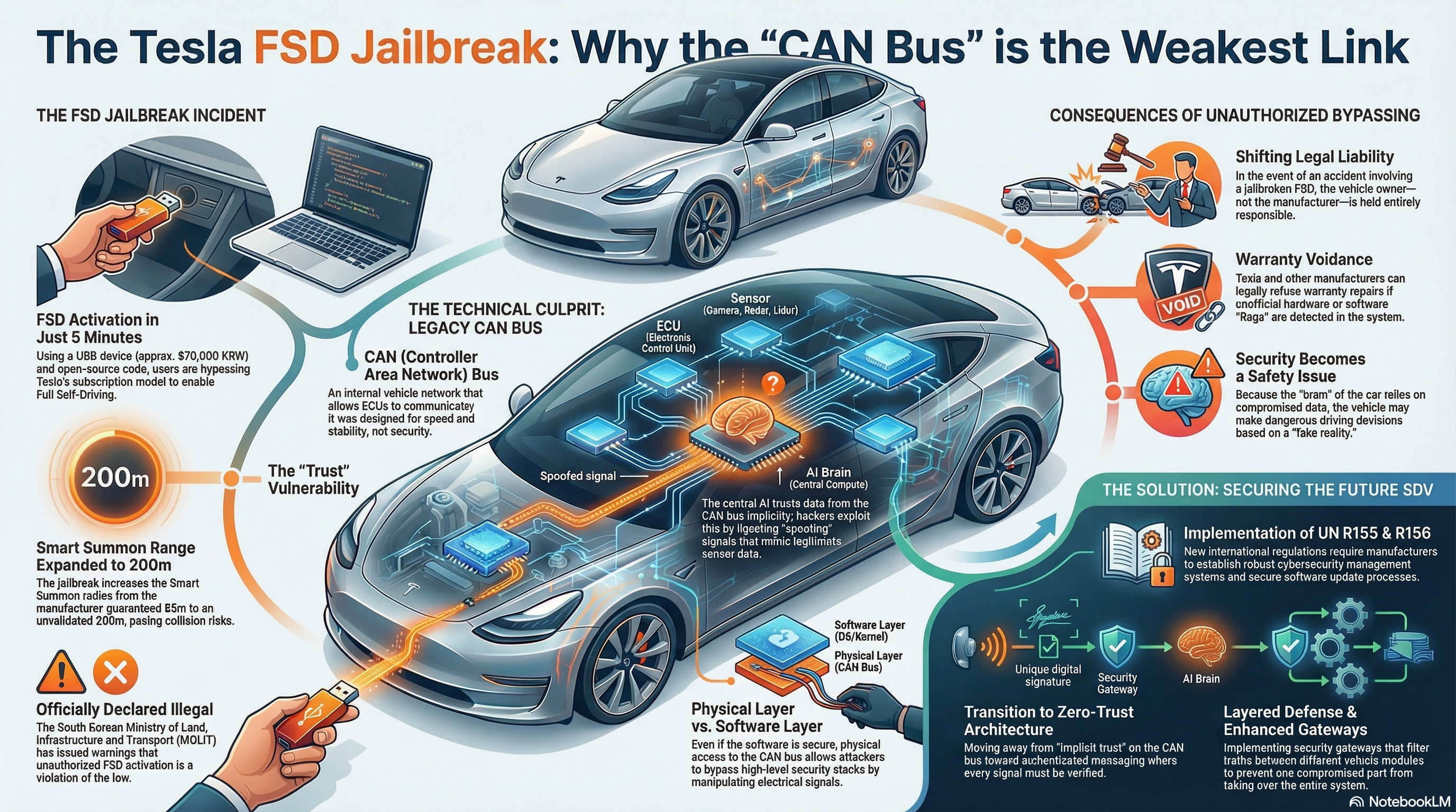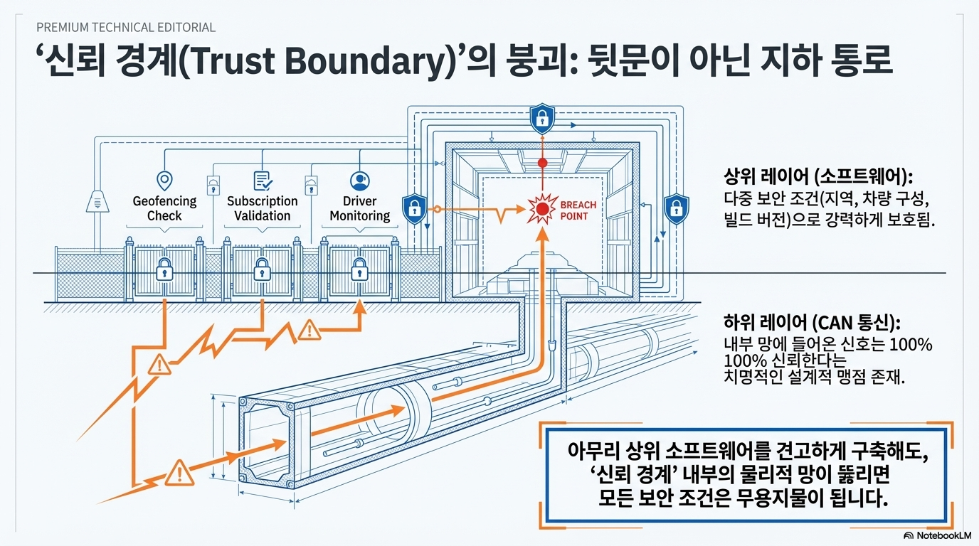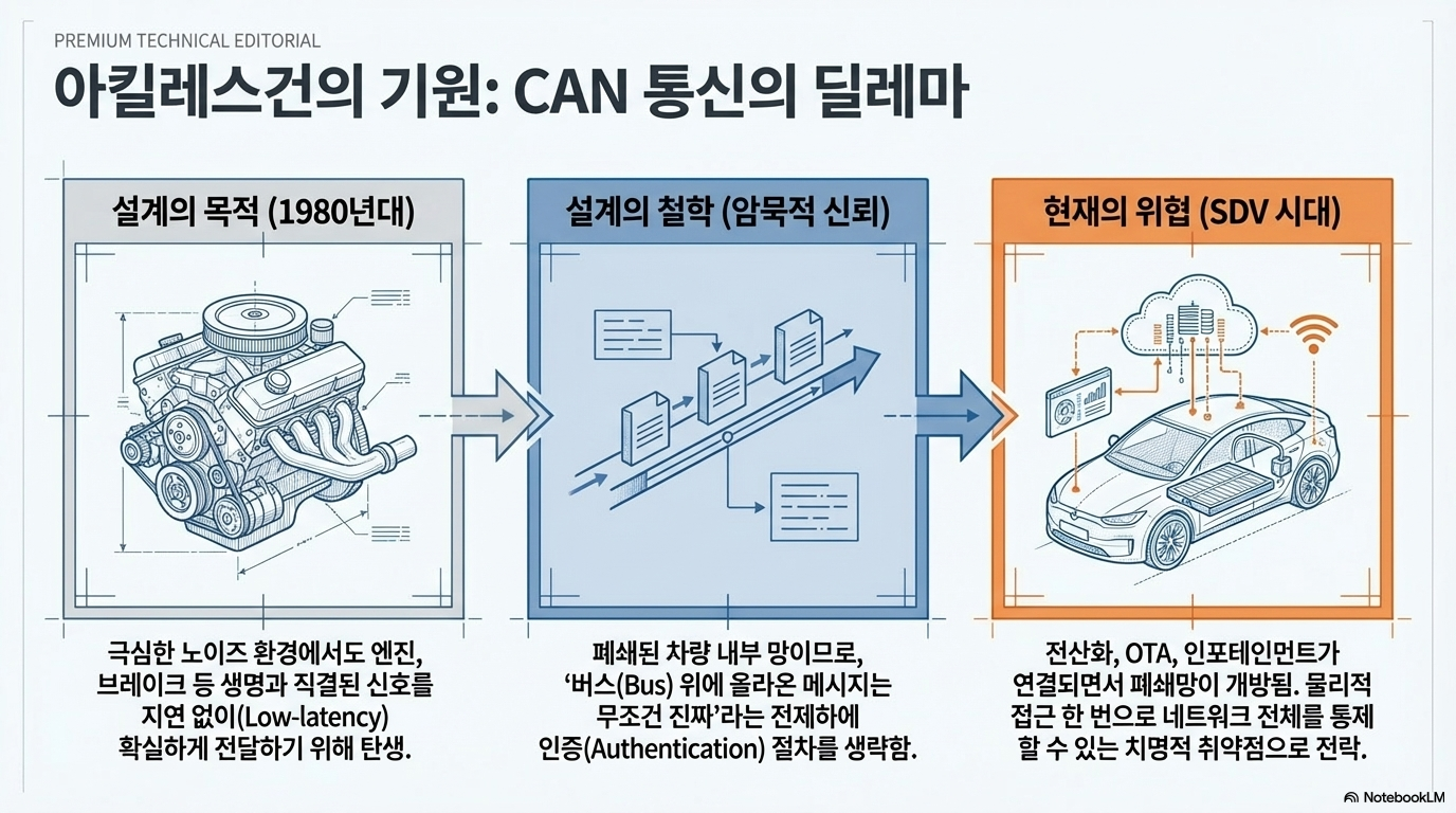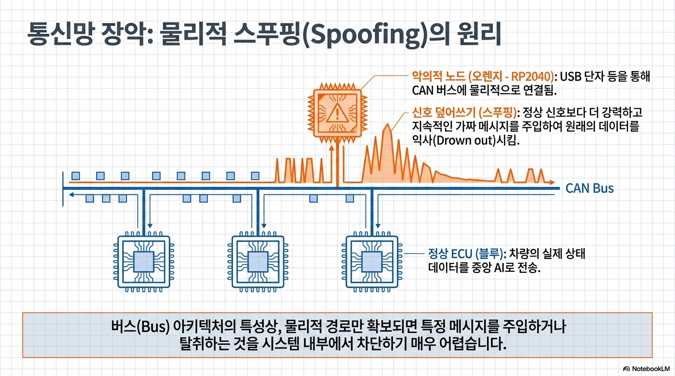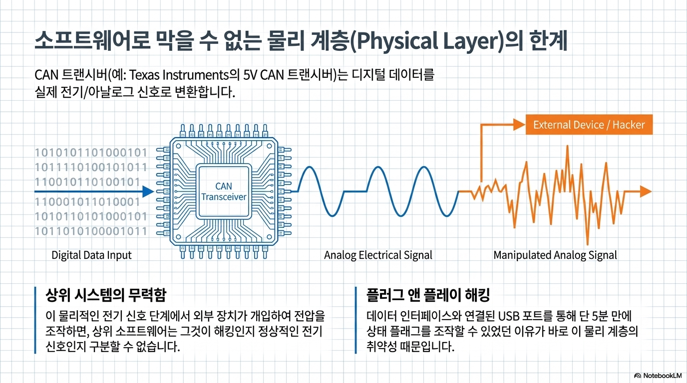 여기서 '기술적 불일치'가 발생합니다. 상위 소프트웨어는 최첨단 AI로 구동되지만, 그 명령을 전달하는 통신망인 CAN 버스는 외부 침입에 대한 인증 절차가 거의 없는 30년 전 방식을 고수하고 있습니다. 즉, 물리 계층(Physical Layer)인 CAN 버스에 직접 접근할 수만 있다면, 상위 소프트웨어가 아무리 견고해도 시스템은 속수무책으로 뚫릴 수밖에 없습니다.
