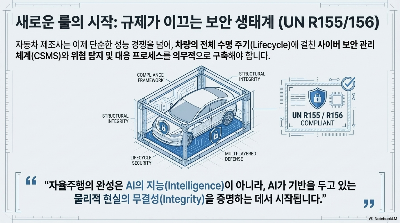 이를 해결하기 위해 국제 사회는 이미 UN R155(사이버 보안 관리 체계) 및 **R156(소프트웨어 업데이트 관리 체계)**와 같은 엄격한 규제를 도입하고 있습니다. 제조사들 또한 다음과 같은 전략적 대응이 필요합니다.