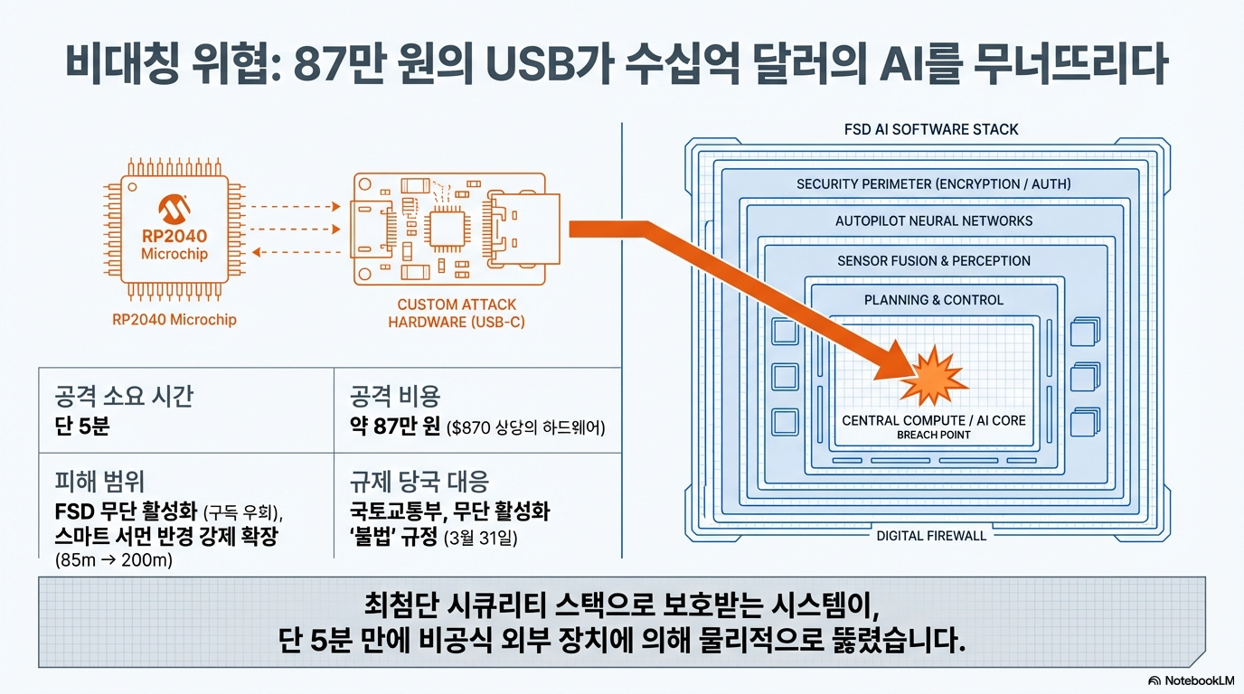 테슬라의 핵심 자율주행 기능인 FSD(Full Self-Driving)를 경험하기 위해서는 수천만 원의 일시불 결제나 매달 고가의 구독료를 지불해야 합니다. 차주들에게 이 비용은 상당한 심리적, 경제적 장벽으로 작용합니다. 그런데 최근 단돈 87만 원과 USB 장치 하나로, 단 5분 만에 이 장벽을 허무는 '탈옥(Jailbreak)' 사례가 공개되며 자동차 업계에 큰 충격을 주고 있습니다.