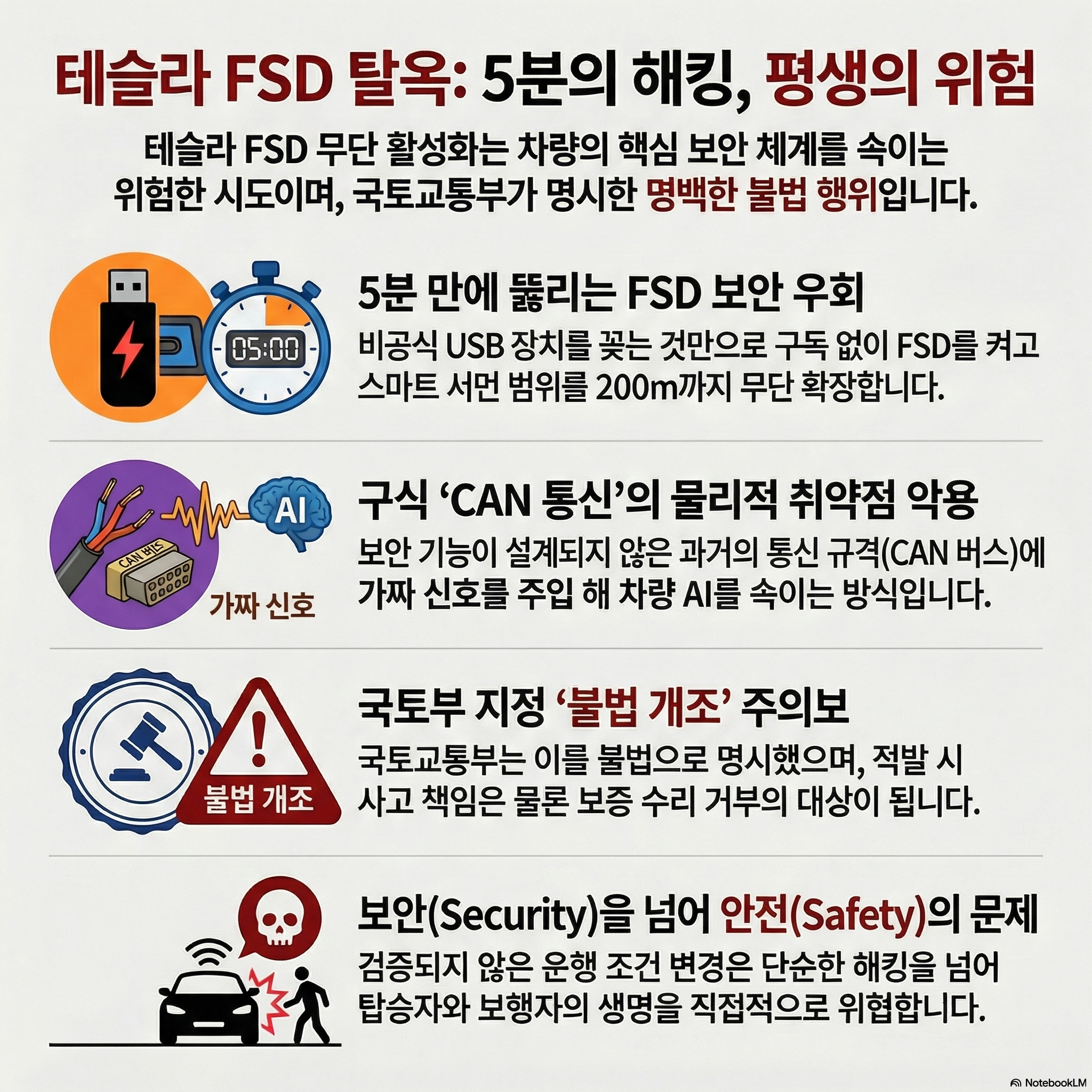 이러한 보안 위협에 대해 테슬라 코리아는 해당 취약점을 인지하고 대한민국 국토교통부에 즉각 보고했습니다. 이에 국토교통부는 지난 3월 31일 보도 자료를 통해 비공식 외부 장비를 통한 FSD 무단 활성화가 명백한 법적 위반임을 공식 선언했습니다.