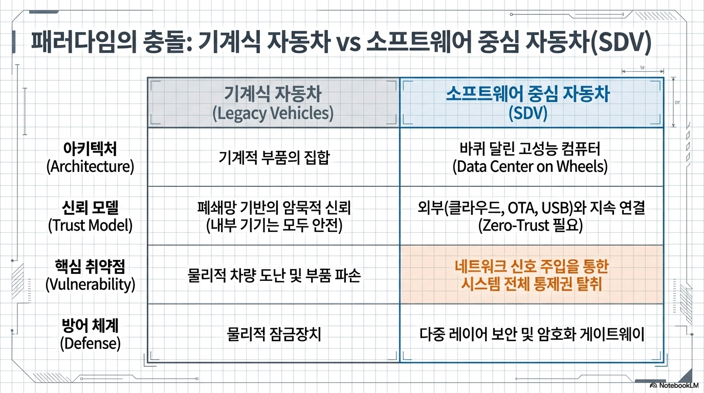 과거의 자동차는 외부와 단절된 기계 장치였기에, 내부 장치(ECU, 제어기)끼리는 서로를 무조건 신뢰하도록 설계되었습니다. 하지만 현대의 자동차는 소프트웨어가 중심이 되어 차량 전체를 제어하는 **SDV(Software Defined Vehicle)**로 진화했습니다. 하드웨어가 아닌 소프트웨어 업데이트(OTA) 한 번으로 차량의 성능이 바뀌는 시대가 된 것입니다.